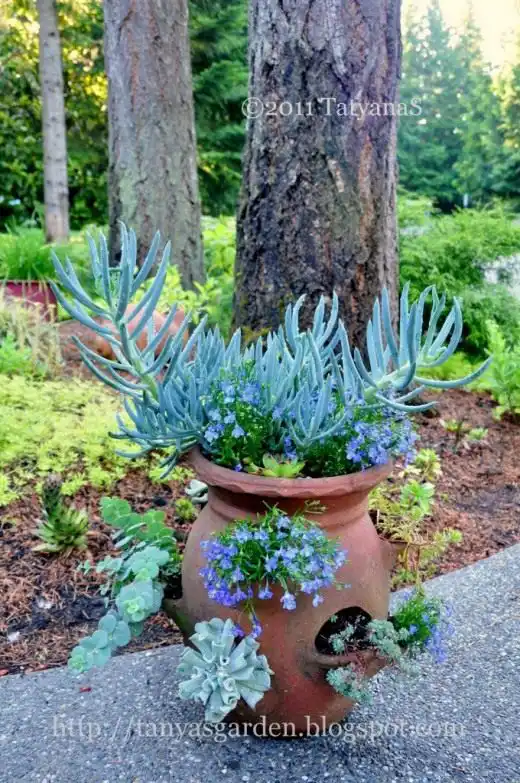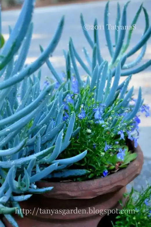 Синенька Лобелія добре уживається з сукулентами, хоча вимоги до поливу вони зовсім різні. Сукуленти, хоч і можуть протриматися довгий час без води, її люблять. Пам'ятаю, як, закінчивши з сукулентами, я шукала, чим би засадити «кімнатки», що залишилися. На очі потрапили крихітні рослини лобелії, які я купила для інших цілей. Експеримент удався. Живуть мирно та дружно.