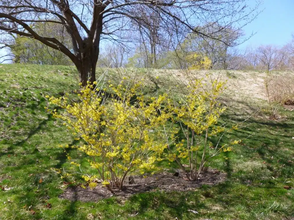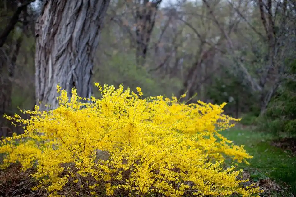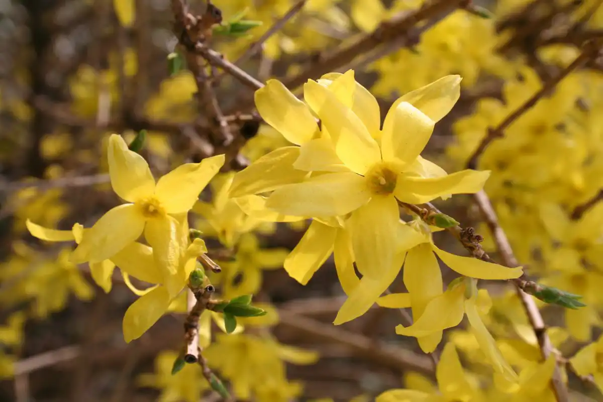 Рання весна, на деревах і чагарниках лише починають набухати нирки, а форзиція вже вкрита золотисто-жовтими квітками, хоча її листя ще не розпустилося. У середній смузі України цей чагарник починає цвісти у квітні-травні, а в південних районах - у лютому-березні. Яскраві плями квітучих форзицій надзвичайно оживляють краєвид. Декоративне і листя — досить велике, яскраво-або темно-зелене, гладке, «прохолодне», воно зберігає соковите забарвлення до глибокої осені і опадає лише наприкінці жовтня — на початку листопада. Красива сама форма куща - пагони дугоподібно згинаються і никнуть.