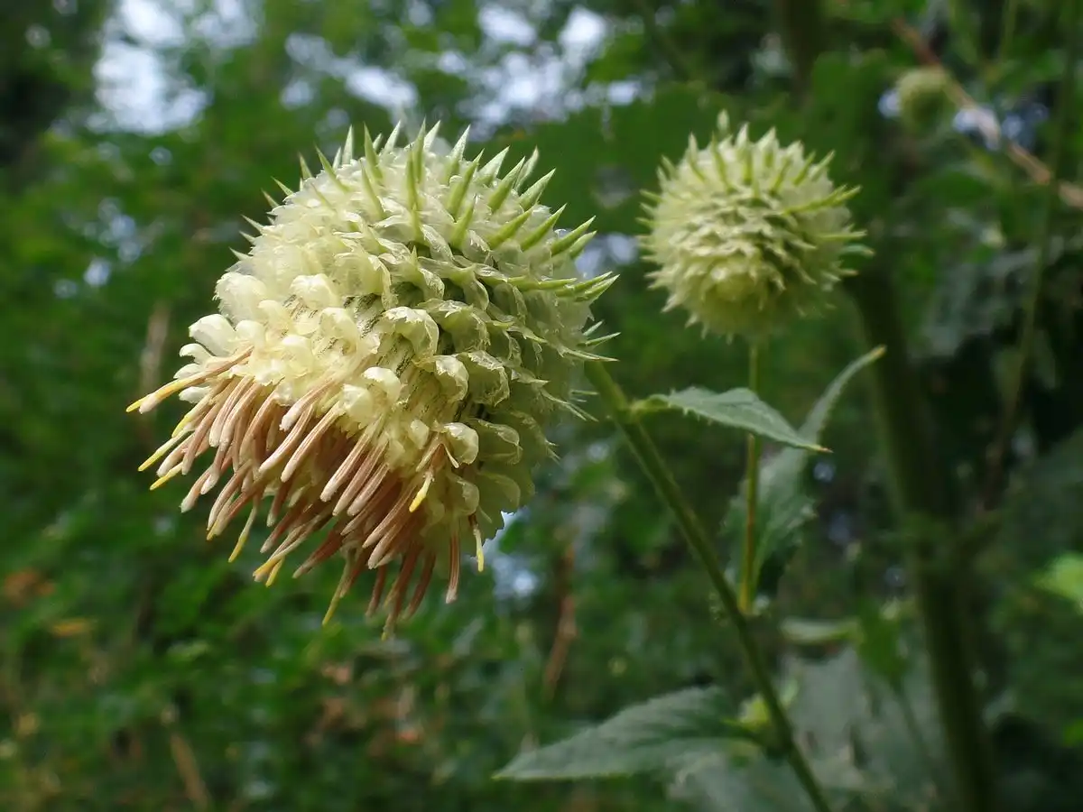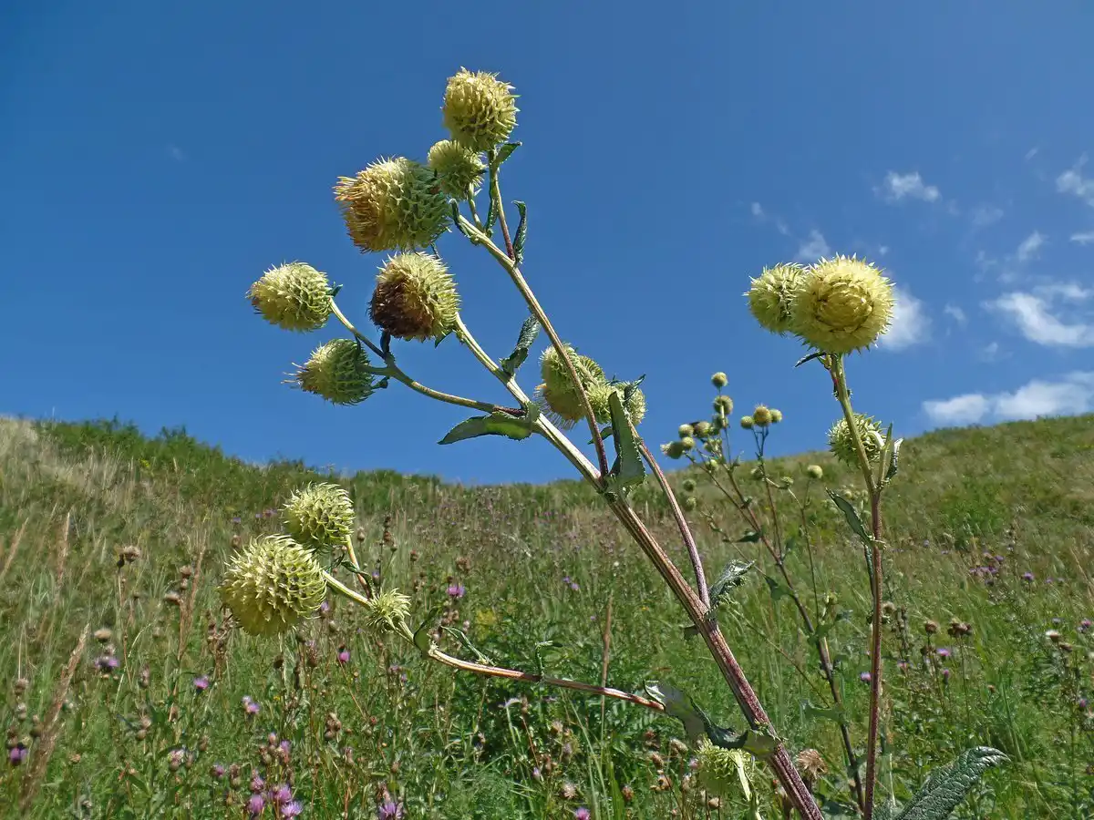 А чому «поникла»? При цьому слові уяву малює якусь хирляву пляшку з пониклим листям. Нічого подібного! Альфредія поникла - це потужна багаторічна трав'яниста рослина висотою 2,5-3 метри, з міцним стеблом в основі діаметром до 5 см, з довгим (до 70 см) довгасто-яйцевидним листям і великими (у поперечнику до 5 см) квітковими кошиками.