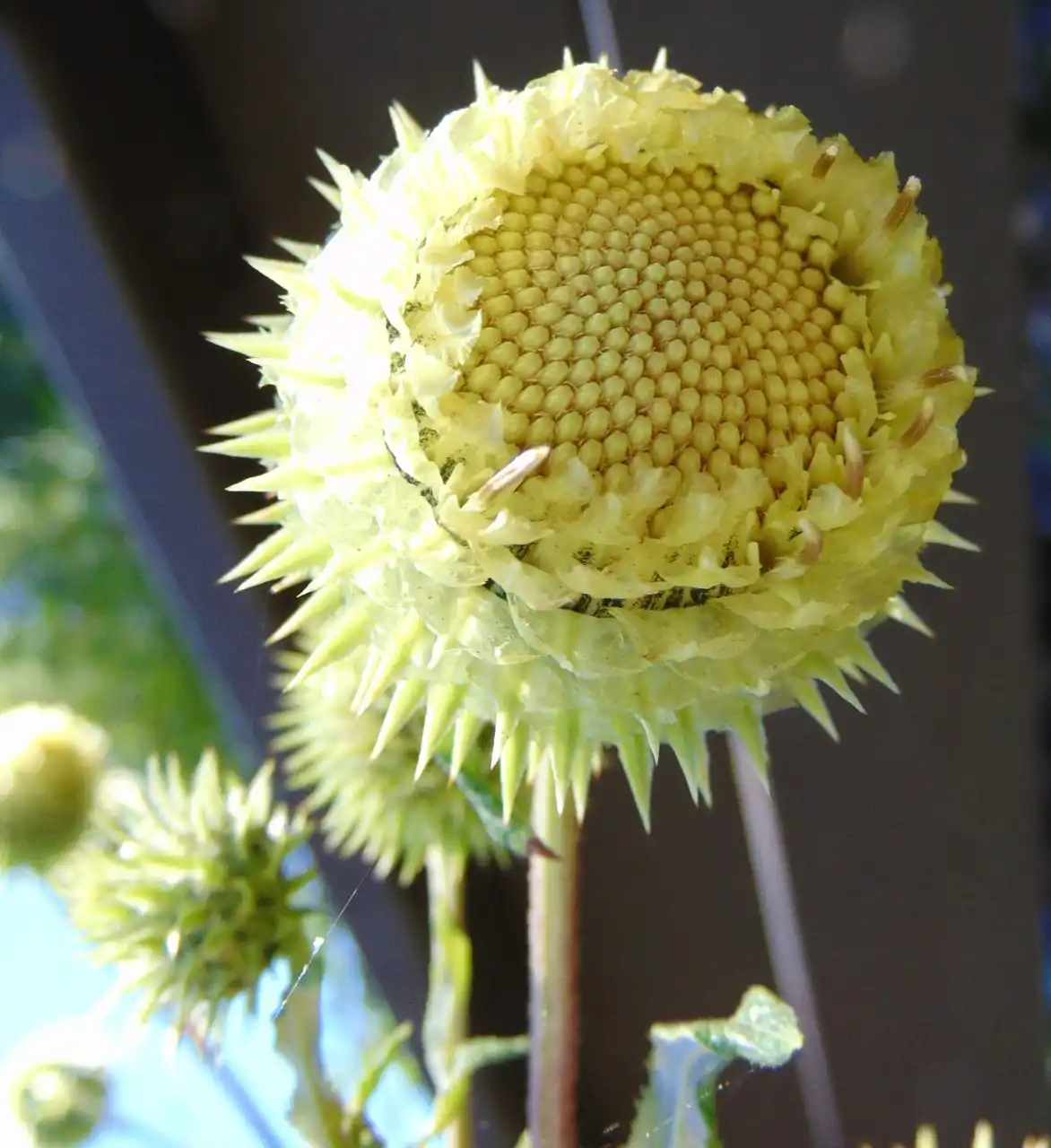 У цих кошиках вся справа — вони дивляться вниз, наче схиливши голову. Звідси назва поникла. І це добре, що вниз (а куди їм ще дивитися з такої висоти!), інакше ми не змогли б розглянути всієї їхньої краси. А краса в їхній незвичайності: обгортка великої головки черепітчаста, багаторядна, крайові квітки жовто-зелені, а центральні — дуже густі й довгі (до 2,5 см), дружно стирчать в один бік, нагадуючи цівки з душу.