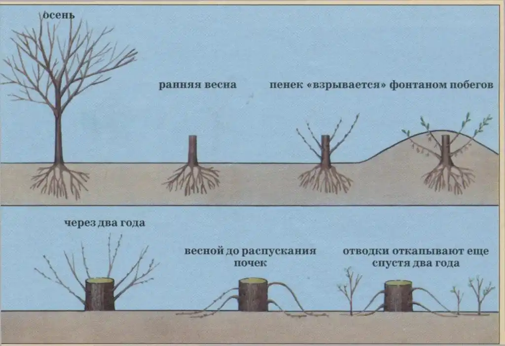Провесною дерево спилюють на 5-6 см вище рівня грунту і замазують рану садовим варом. Через деякий час пеньок буквально «вибухає» фонтаном пагонів, їх може бути до 20 на одній рослині. Тепер їх корисно підгодувати настоєм коров'яку (1:10).