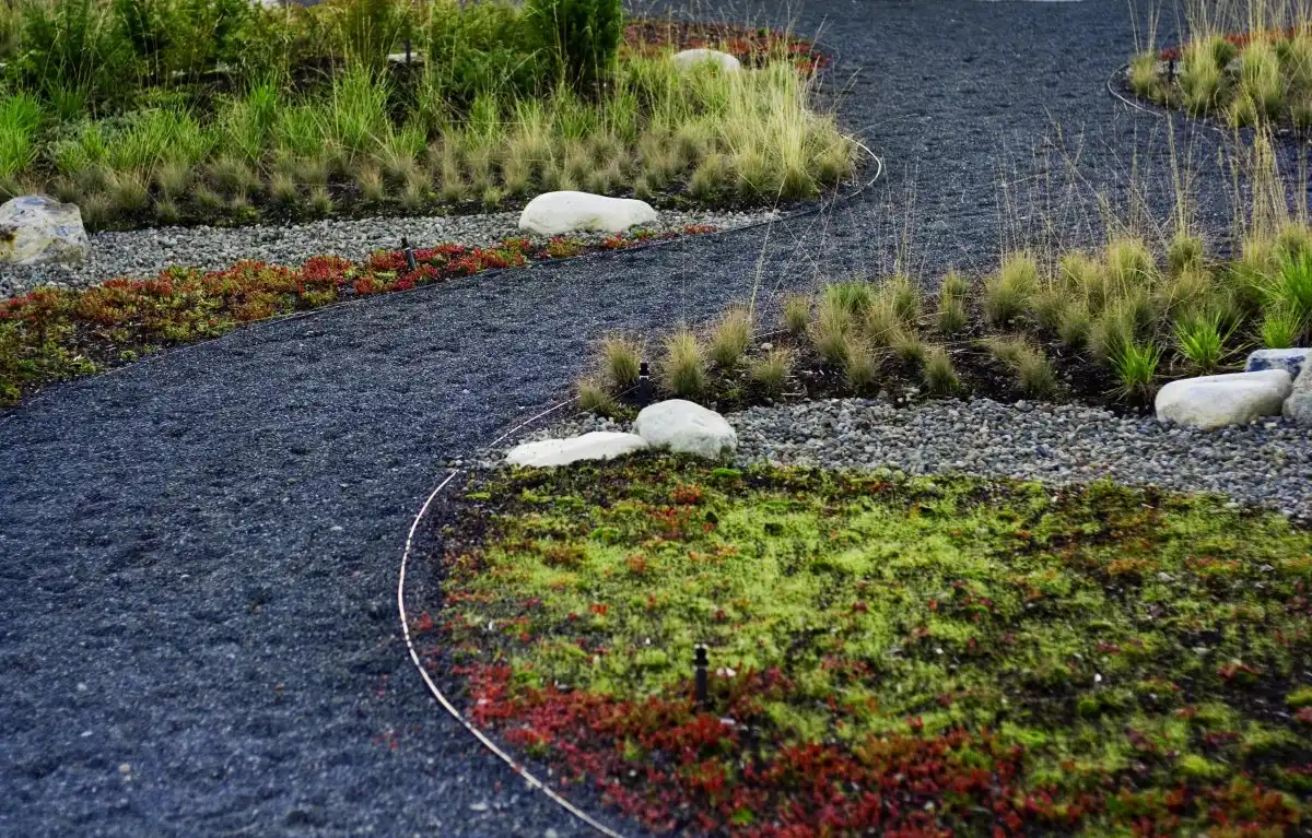 Доріжка із гравію дуже екологічна, натуральний матеріал виглядає природно та ненав'язливо та поєднується практично з будь-яким стилем оформлення. До того ж гравій дуже пластичний і сипкий, і тому доріжці легко можна надати будь-яких контурів.