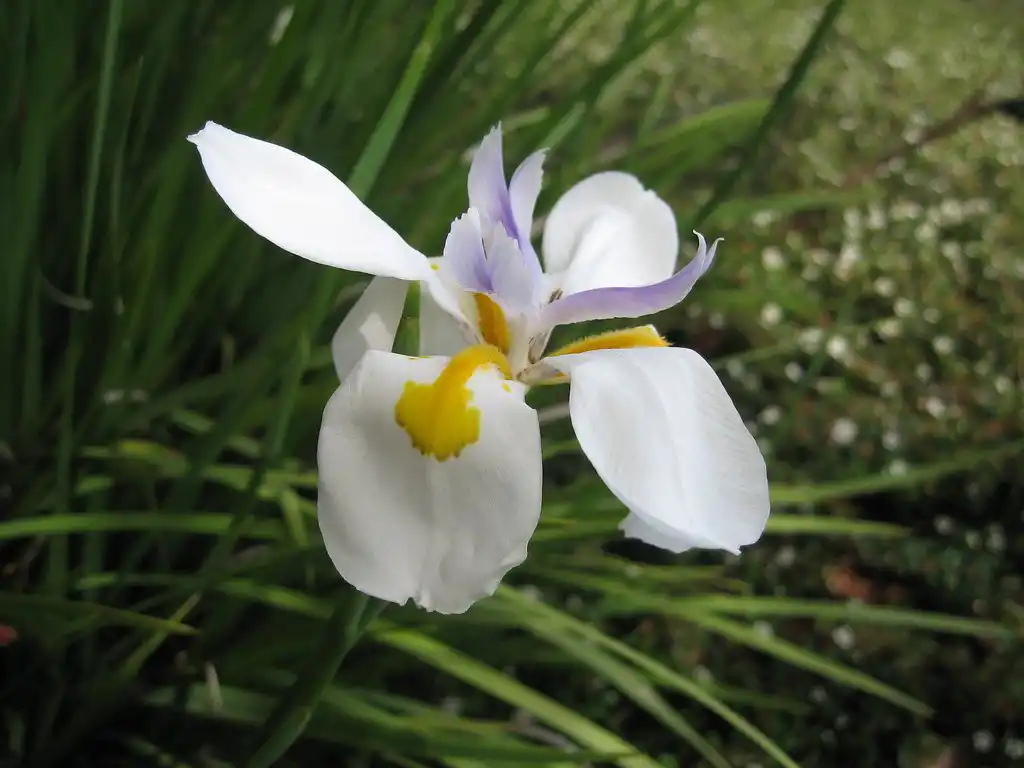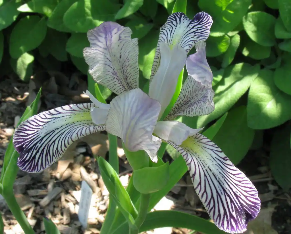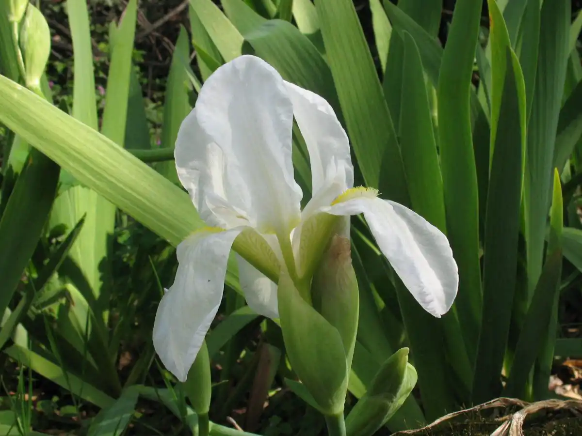 Бородатий вид гібридного походження. Квітконіс розгалужений, до 70 см заввишки, несе 5-7 білих з блакитним відтінком ароматних квіток. Листя сиве, велике мечоподібне. Цвіте наприкінці травня. Насіння не дає, розмножується лише вегетативно. Недостатньо морозостійок. У культурі з XV ст.