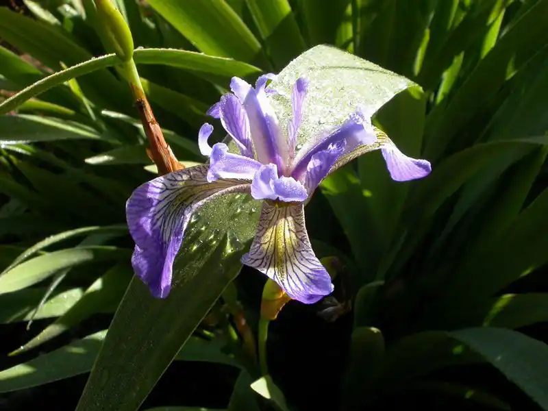 Листя мечоподібне, сизе через восковий наліт, до 60 см завдовжки. Квітконос до 80 см заввишки, у верхній частині розгалужений. Квітки великі, майже сидячі, ароматні, ніжно-блакитні. Листочки обгортки плівчасті. Цвіте у червні. Плодоносить у серпні.
