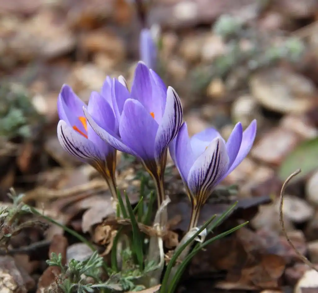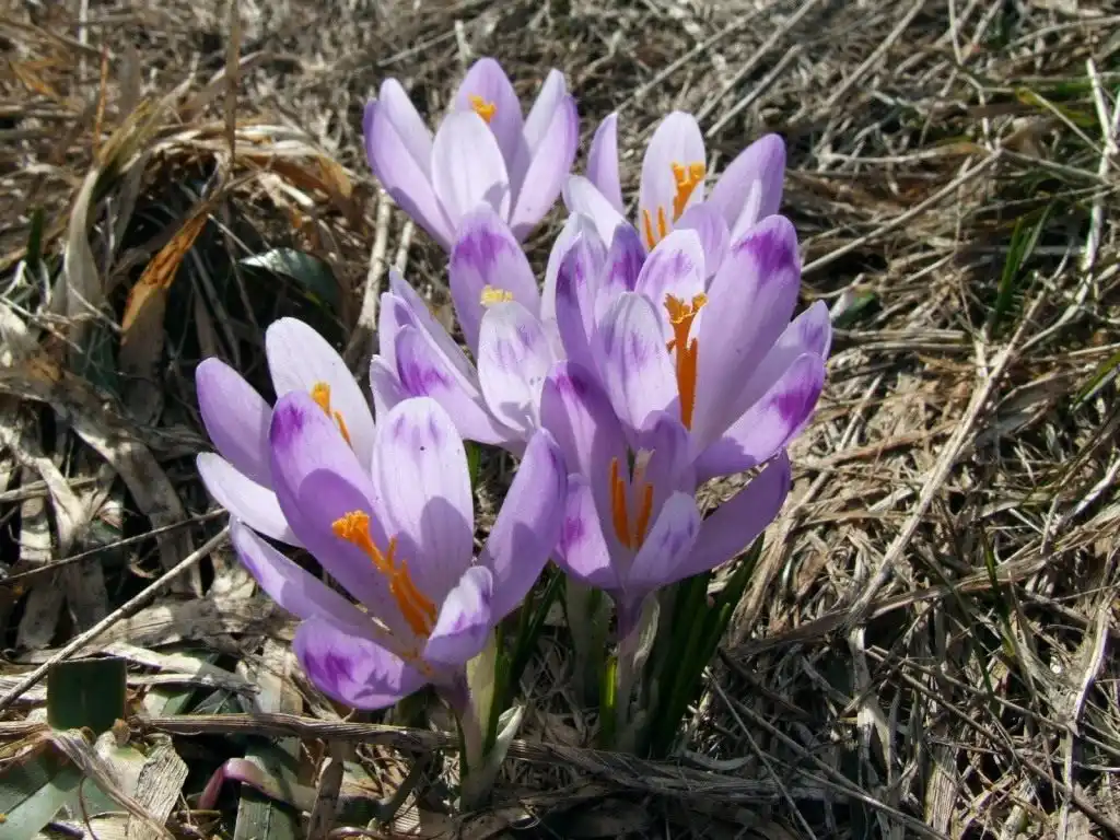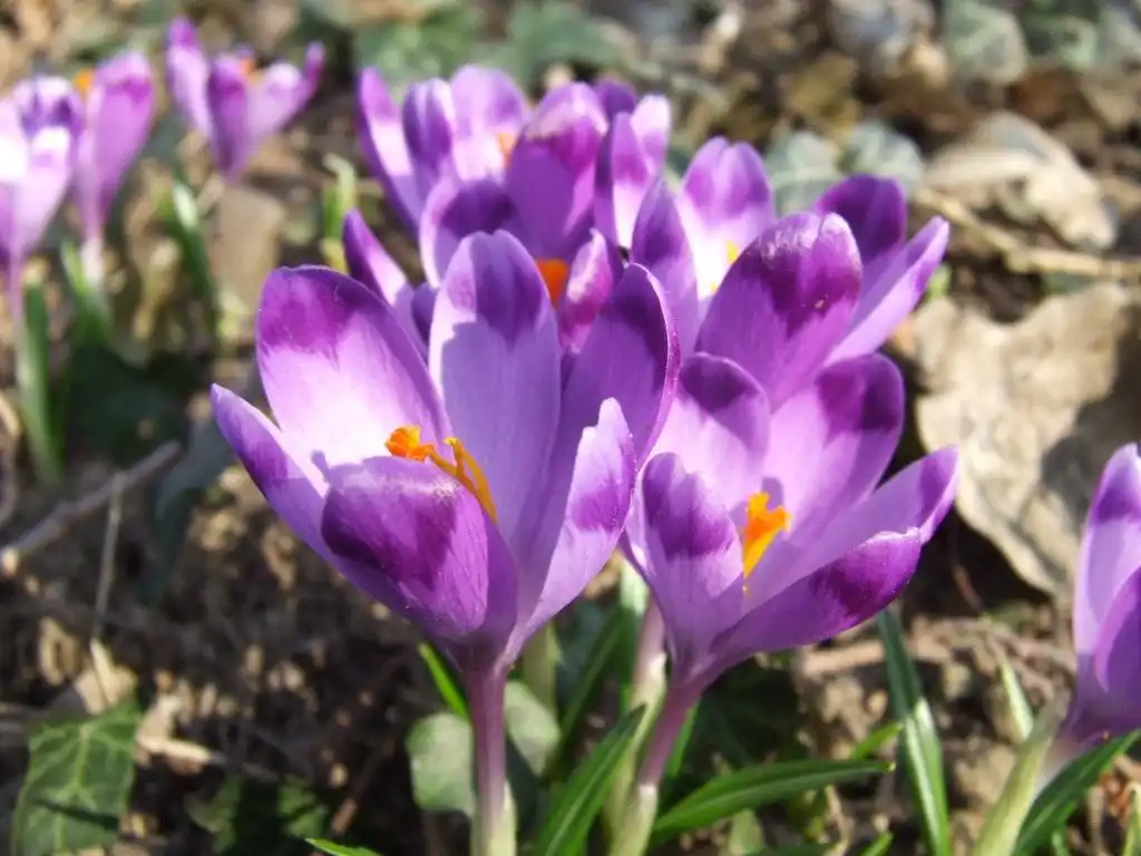 Шафран весняний, або крокус весняний (Crocus vernus) - Висота квітконоса 1-3 см; оцвітина 3,5-5 см у діаметрі. Забарвлення квіток біле, лілове, фіолетове. Цвіте у другій половині квітня. Найбільш поширені сорти (у дужках зазначена довжина листочків оцвітини):