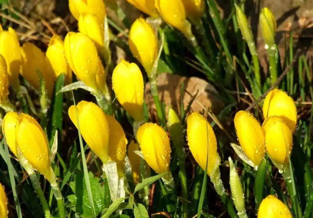 Шафран сузіатська, або крокус сузіатський (Crocus susianus) - Висота квітконоса 6-10 см. Оцвітина діаметром до 4 см золотисто-жовтого кольору, з темно-пурпурними смужками зовні. Цвіте у першій половині квітня.