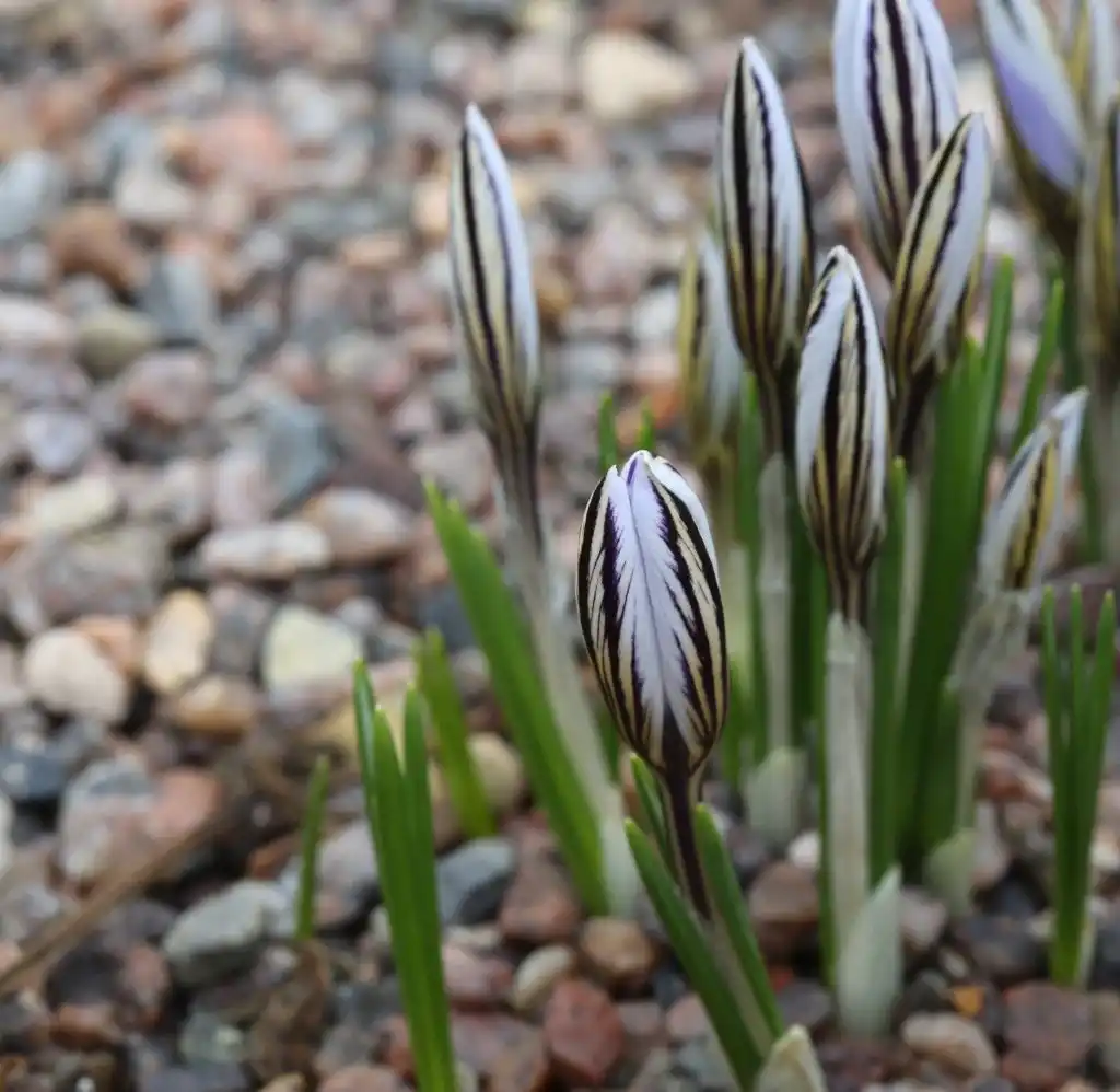 Шафран сітчастий, або Крокус смугастий, або Крокус сітчастий, або Шафран смугастий (Crocus reticulatus) - Висота квітконоса 6-10 см. Оцвітина діаметром 3-4 см, світло-фіолетовий всередині, з темно-коричневими смужками зовні. Цвіте у першій половині квітня.