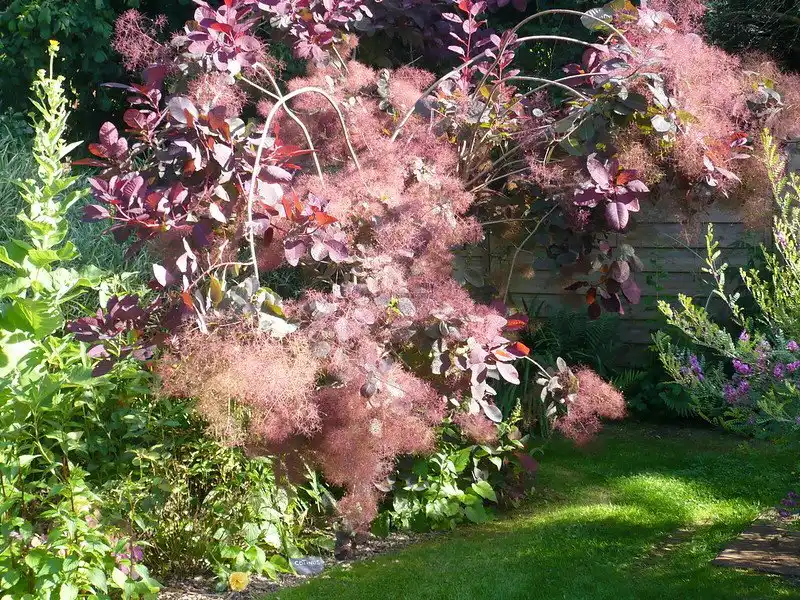 Скумпія, латинська назва - Cotinus. Густа куляста крона відразу полюбилася садівникам. Хоча чекати на перше цвітіння доводиться відносно довго. Вперше це відбувається у віці 6-8 років. Але це варте того. Як тільки чагарник зацвіте, його огортає рожеве, зелене або фіолетове забарвлення. Цей ефект відбувається завдяки квітконіжкам. Метельчасті суцвіття покривають крону скумпії своєрідною перукою. Звідси й друга назва чагарника — перукове дерево. Якщо на таку рослину дивитися здалеку, то вона набуває фантастичного вигляду кольорових хмар, що опустилися на землю. У такому вигляді скумпія залишається з кінця червня до листопада-грудня.