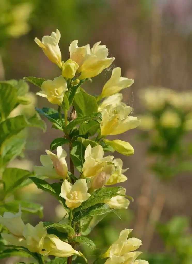 Вейгела Міддендорфа (Weigela middendorffiana). Листопадний чагарник висотою 1-1,5 м з висхідними пагонами. Листя яскраво-зелене, опушене по жилках з обох боків. Сірчано-жовті, з помаранчевими плямами та крапками квітки, поодинокі або зібрані по 2-6 на загальних квітконосах. Цвіте двічі на рік, навесні та восени. У нашому кліматі тривалість цвітіння – 25-30 днів. Використовують у одиночних та групових посадках на газоні, по узліссях, під деревами з ажурною кроною.