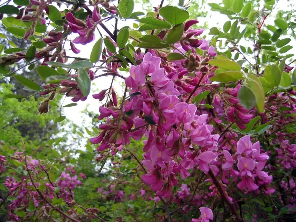 Робінія клейка (Robinia viscosa) - Дерево висотою до 12 м з округлою кроною. Пагони, листя, суцвіття липкі через численні залозисті волоски. Листя велике, яскраво-зелене. Квітки рожево-фіолетові, без аромату, розташовані у численних невеликих прямостоячих кистях. Цвітіння рясне та тривале. Рослини менш зимостійкі та менш посухостійкі, ніж біла акація, але можуть зростати і в середній смузі.