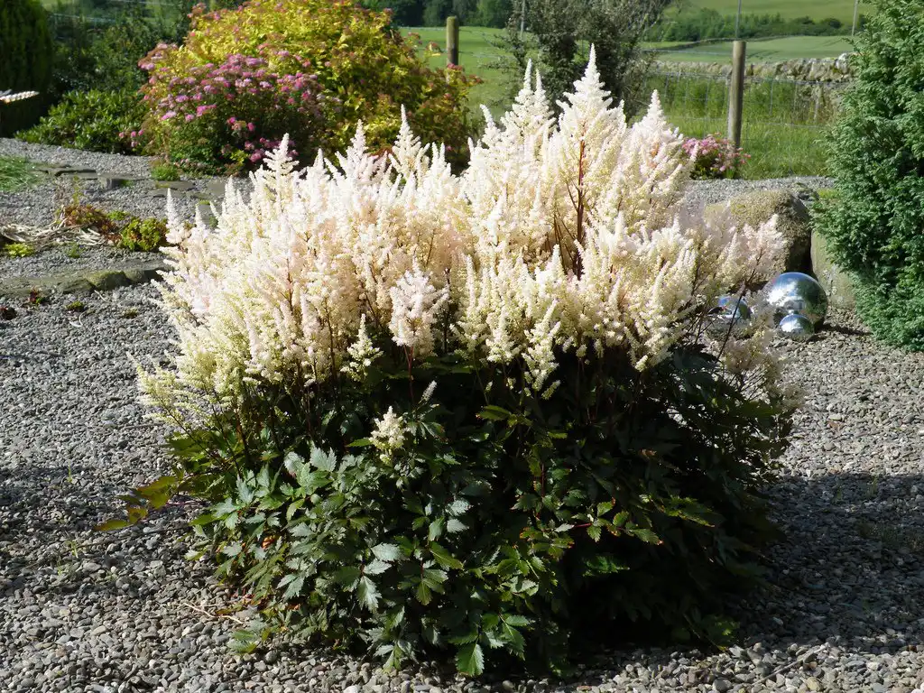 Поряд з астильбою можуть рости першоцвіти, доронікум, гравілат, іберіс, купальниця. На першому плані ефектно виглядають квітучі навесні низькорослі багаторічники, наприклад, різні види ломикаменів, а також крупка, яснотка, живучка, пупочник. Можна спробувати посадити деякі види очитку, наприклад, білий, хибний.
