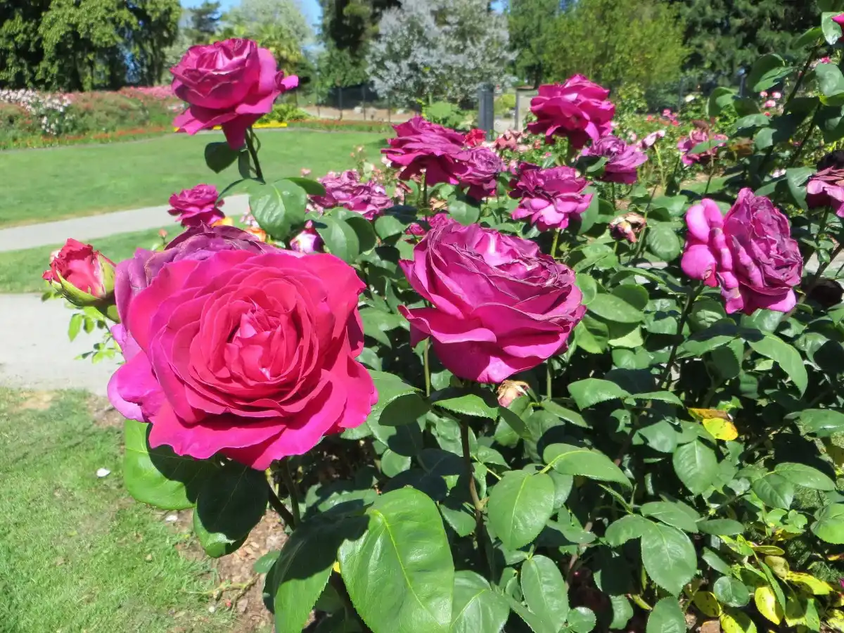 Дещо більш крупноквіткові (6-7 см) і вище зростанням (60 см) зухвало-помітні троянди зрізальних сортів «Хокус Покус» («Hocus Pocus») і «Абракадабра» («Abracadabra») густо-бордового кольору з білими, жовтими і рожевими смужками. непросто.