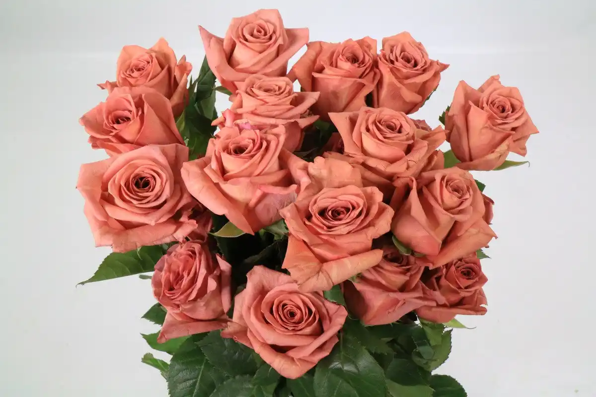 Кавове забарвлення, сформоване бузковими та жовтими відтінками, мають чайно-гібридні троянди: