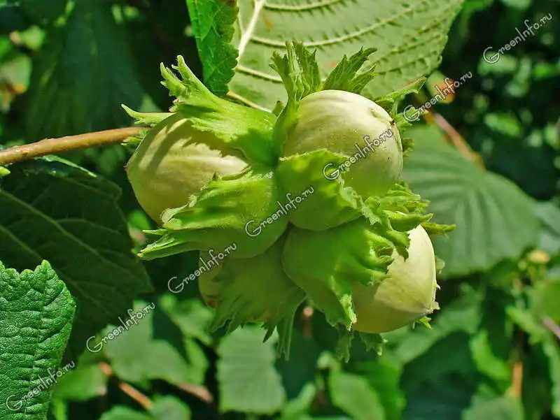 горіхи, округлі або довгасті, 18 мм завдовжки і 13-15 мм у діаметрі, у світло-зелених бархатисто-опушених плодових обгортках, зібрані по 2-5 штук, іноді поодинокі, їстівні