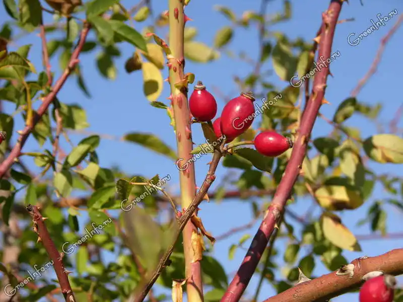 пагони зелені, з сонячної сорони червоно-бурі, з численними, серповидно загнутими вниз, шипами