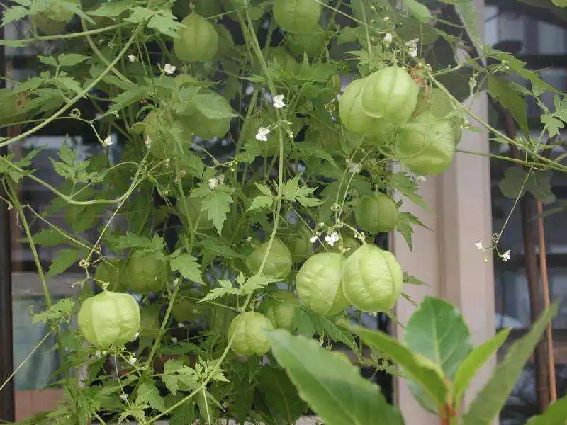 дуже декоративні світло-зелені, пізніше - коричневі опушені насінні коробочки - майже еліпсоїдні тригранні опушені бульбашки з чорними блискучими кулястими насінням 1-1,4 см завдовжки, з малюнком у вигляді білого серця