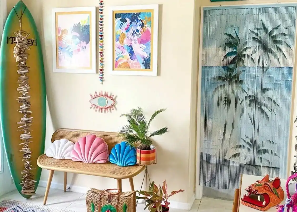 Ця стилістика більше пов'язана з пляжем та водою. Саме тому найчастішим елементом декору стає дошка для серфінгу. Іноді для декору стін доречні декоративні наклейки із зображенням дошки для серфінгу, а не справжня. У цьому стилі переважають блакитні та бежеві відтінки - море, сонце, білий пісочок. Що може бути кращим?