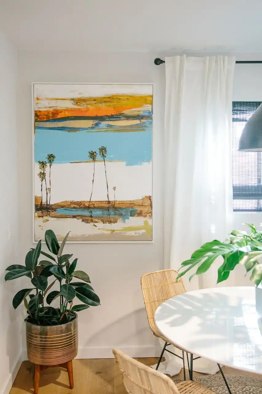 Що ж, почнемо з найпростішого текстиль. Це можуть бути кухонні рушники з принтом зелених пальм і яскравих кольорів, штори, що політають, постільна білизна і навіть оббивка меблів! Підійде як пляжний стиль, так і тропічніший, рослинніший. Про їхню різницю ми поговоримо трохи далі.