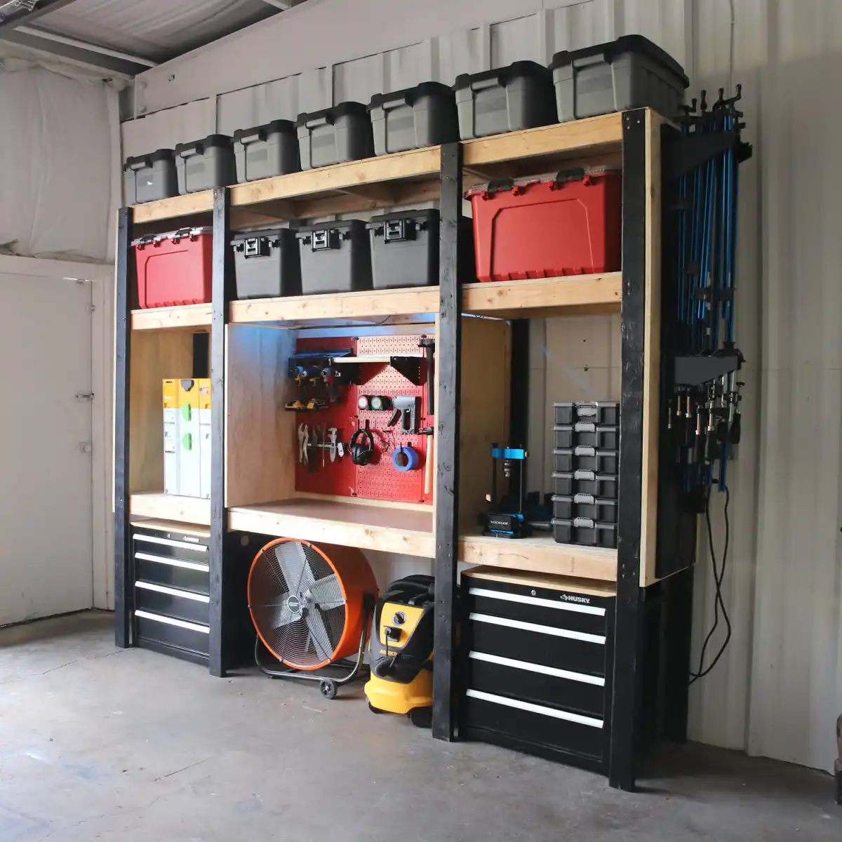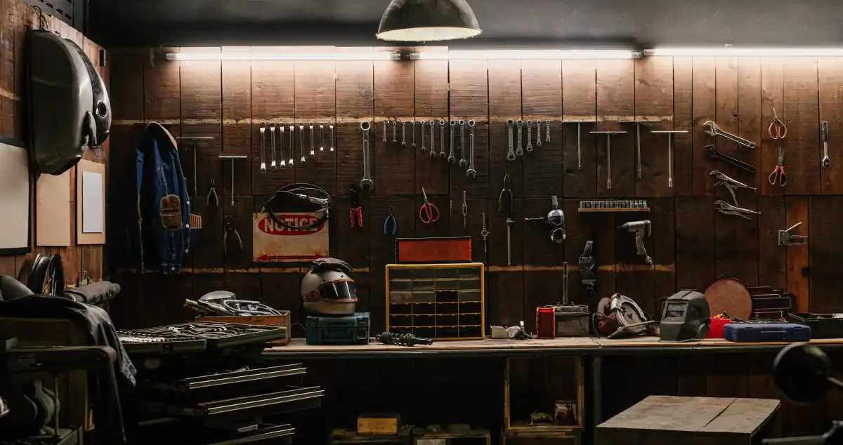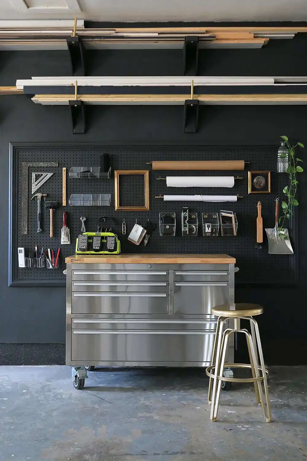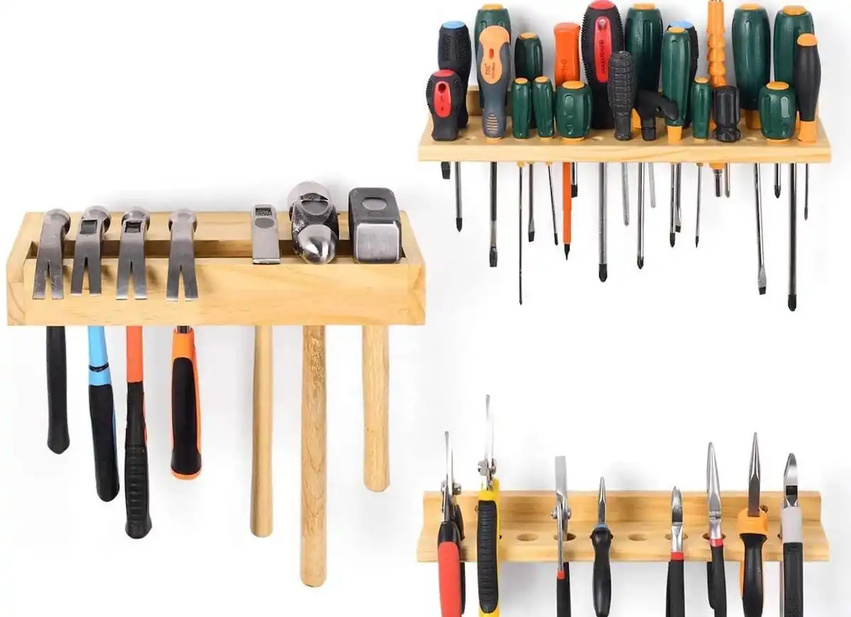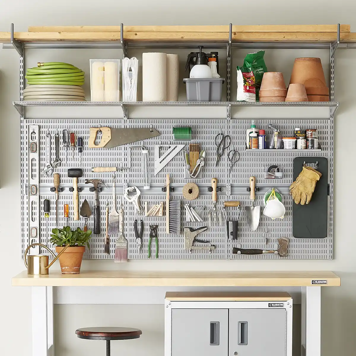 Зберігання речей з використанням настінних кріплень та органайзерів значно заощаджує місце. Візуально все виглядає дуже акуратно і не виникає проблем із пошуком інструментів, оскільки система зберігання є відкритою.