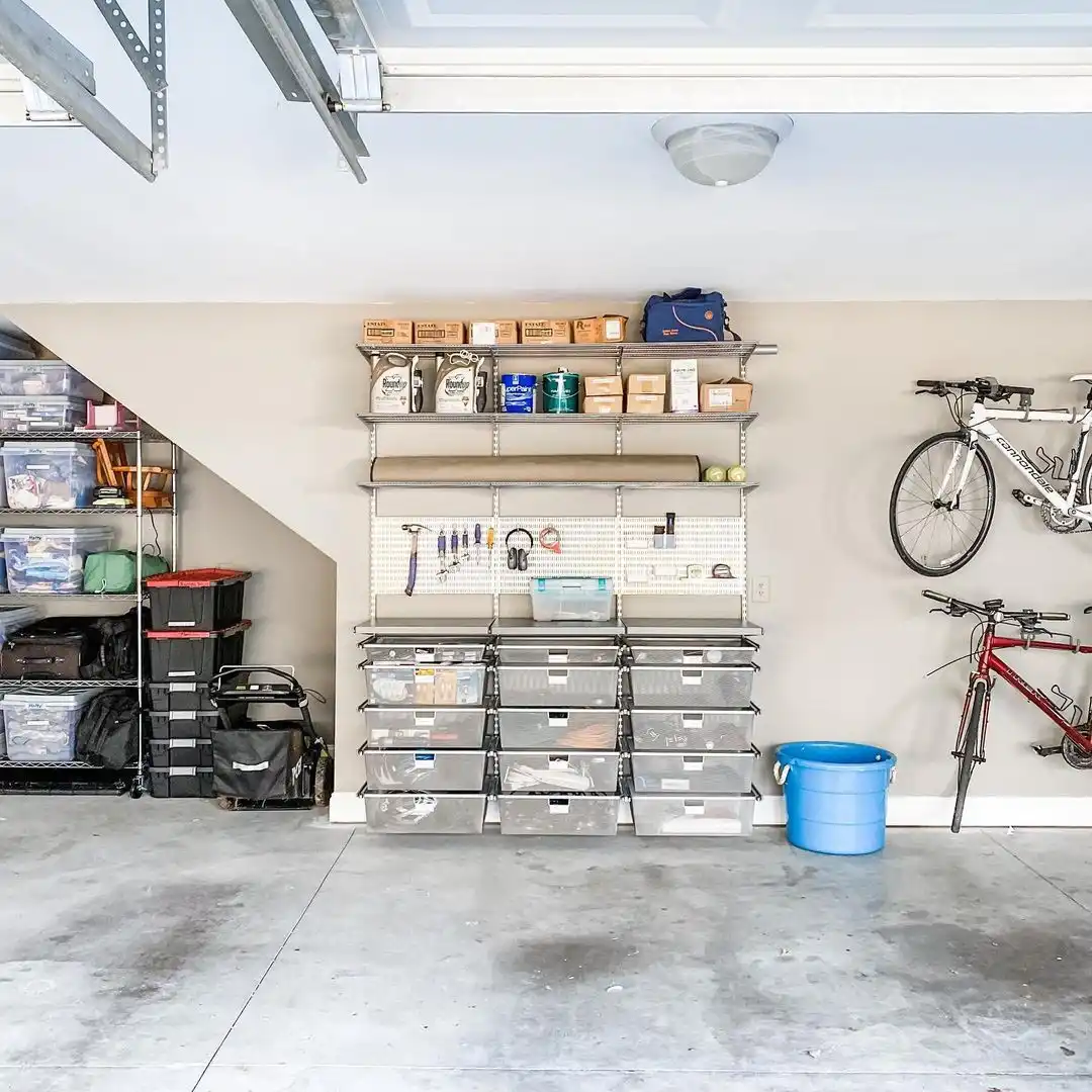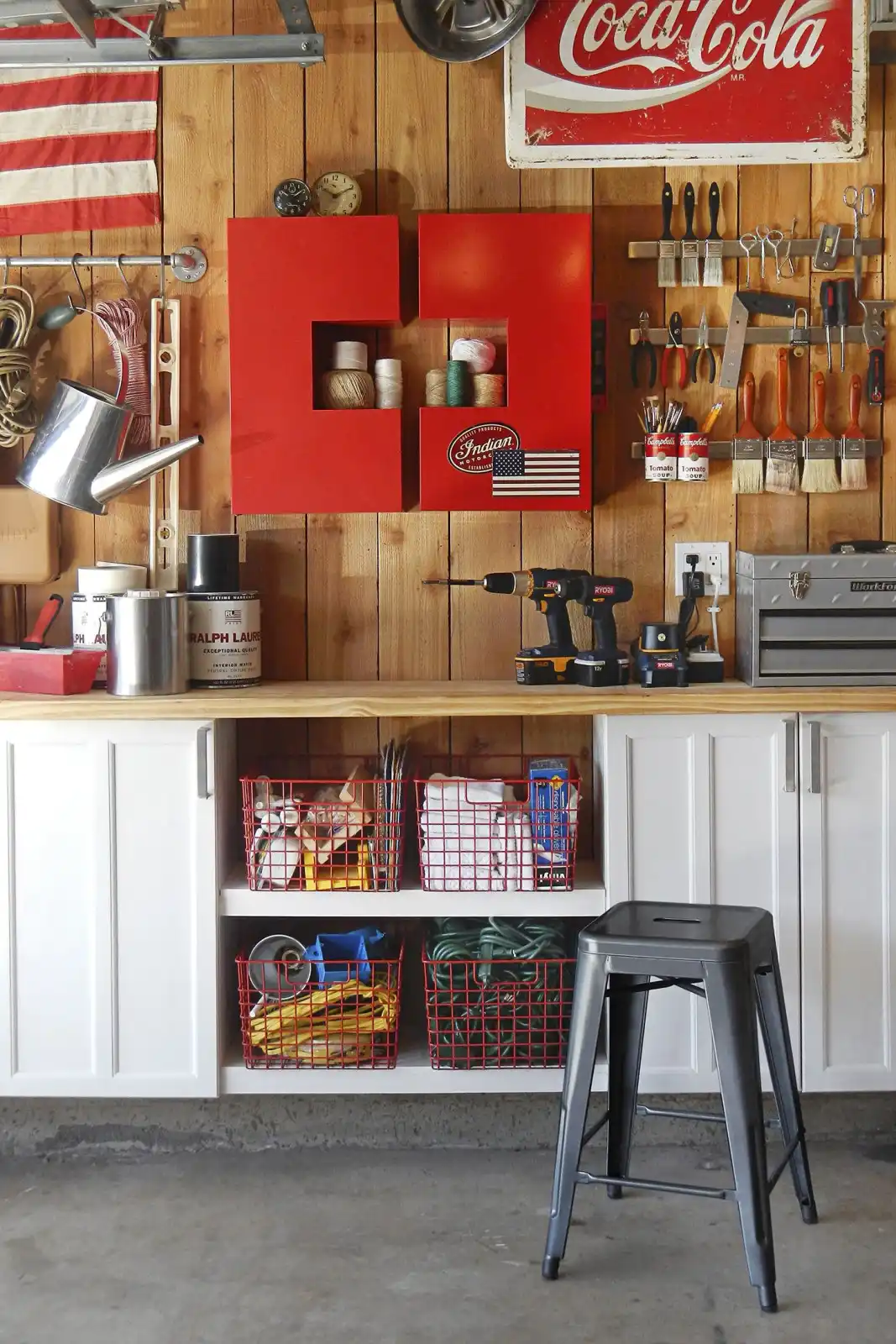 Для того щоб розбавити сірість стін вашого складу інструментів та іншого начиння, можна використовувати колірні акценти. Це можуть бути мінімалістичні картини - вони не займають багато місця, але значно змінюють загальний вигляд інтер'єру. Підійдуть і контрастні бокси для зберігання різних дрібниць. Навіть самі предмети, що зберігаються в гаражі, можуть виступати як контрастний елемент.
