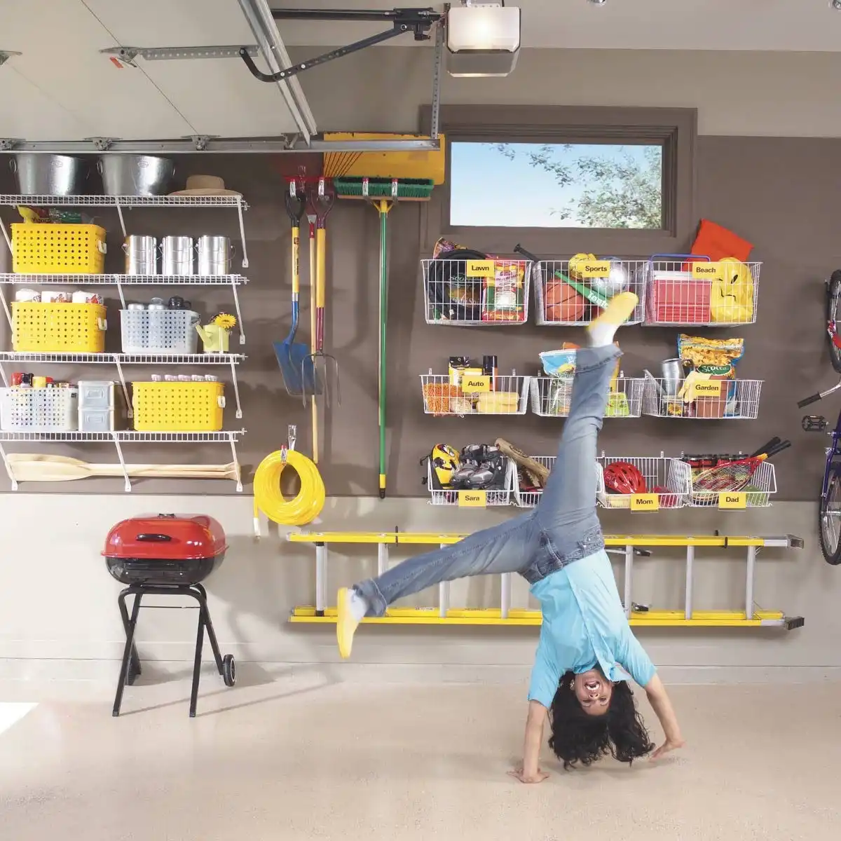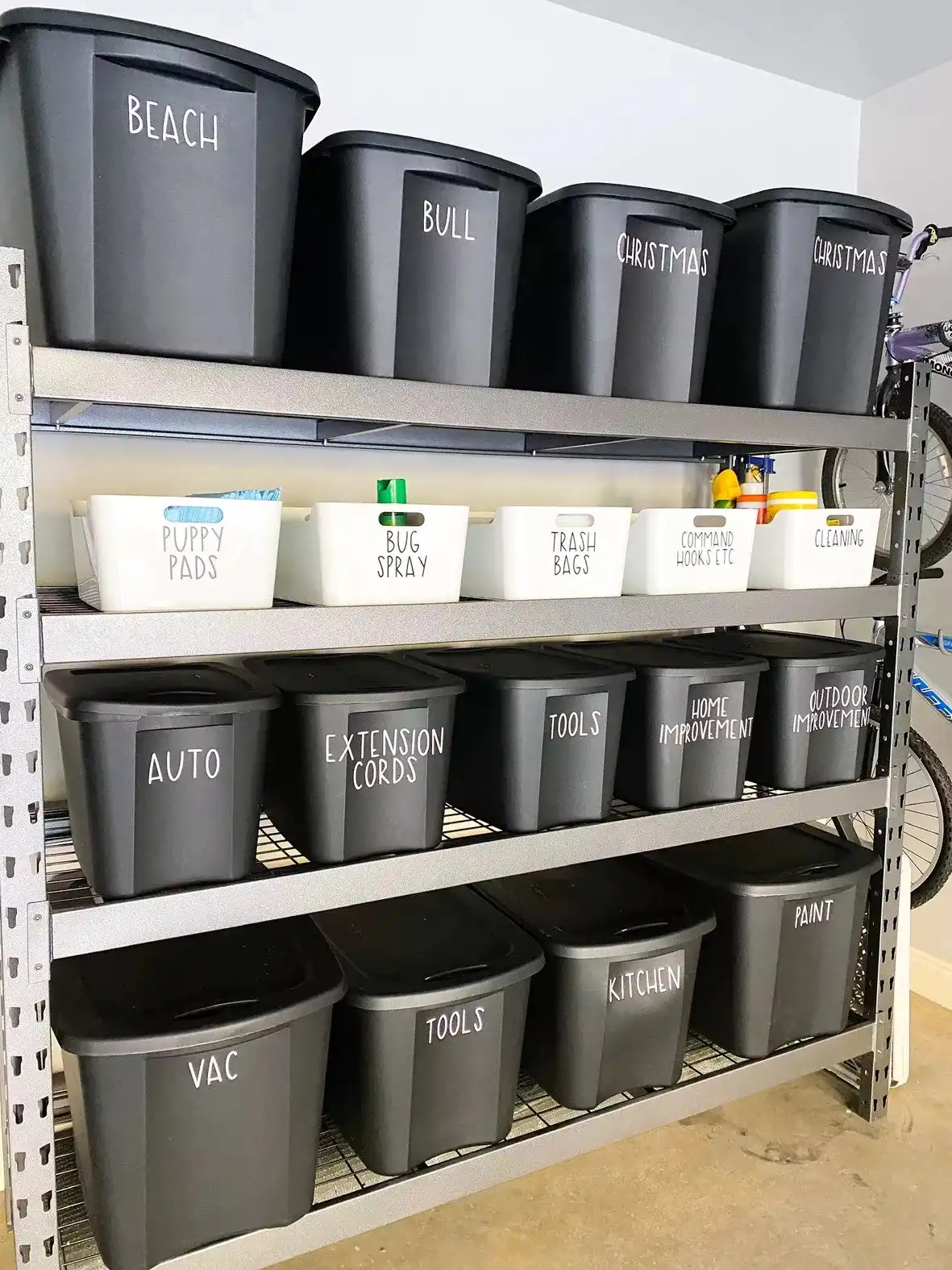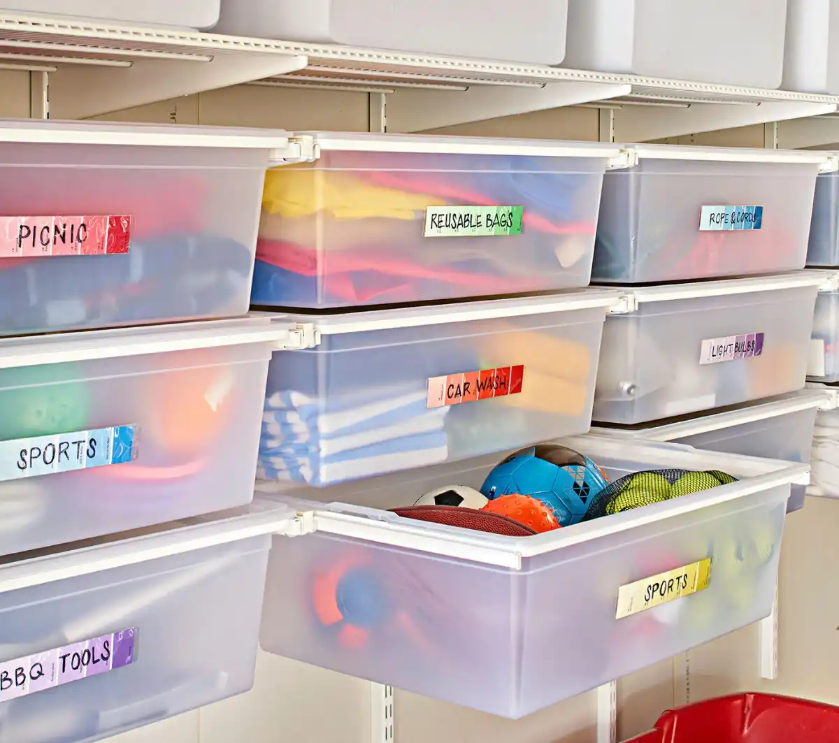 Система з написів на контейнерах допоможе швидше орієнтуватися та знаходити речі у гаражі. Написи можна зробити маркером або за допомогою паперових бирок та скотчу. Виглядає просто і зручно!