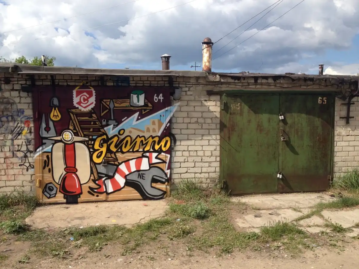 Перше, що ви бачите при вході в гараж, це ворота. Не можна обійти декор воріт стороною. Як на мене, так дуже атмосферно виглядають графіті — надають відповідної атмосфери. Або можна купити вже розмальований тент і декорувати ворота їм. Я все ж таки більше за власний творчі прояви, якщо у вас є бажання та час.