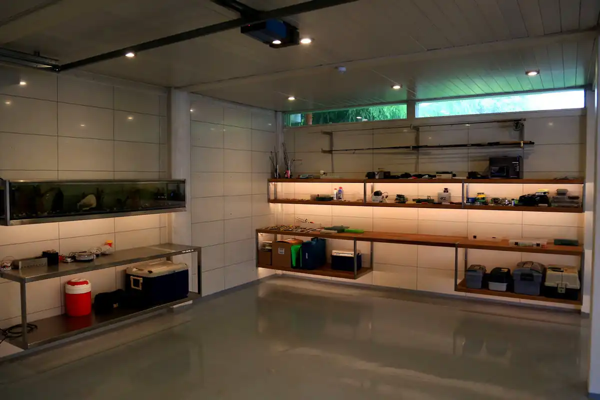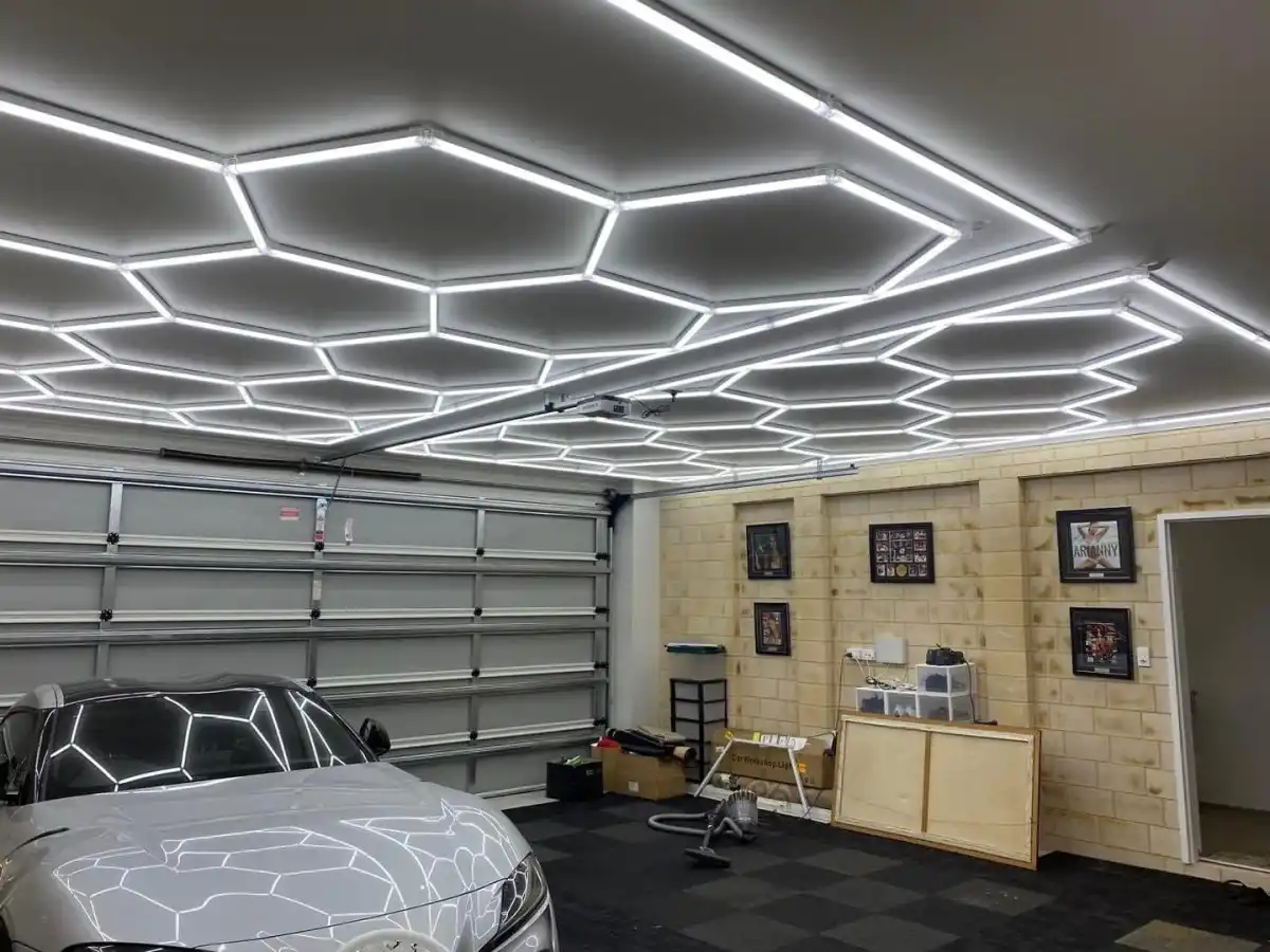 У такому приміщенні як гараж дуже важливе гарне освітлення. Але й освітлення можна перетворити на декорацію, наприклад, використавши фігурні світлодіодні світильники або підсвічування. Світло може бути тепле, холодне або зовсім кольорове — все на ваш вибір.