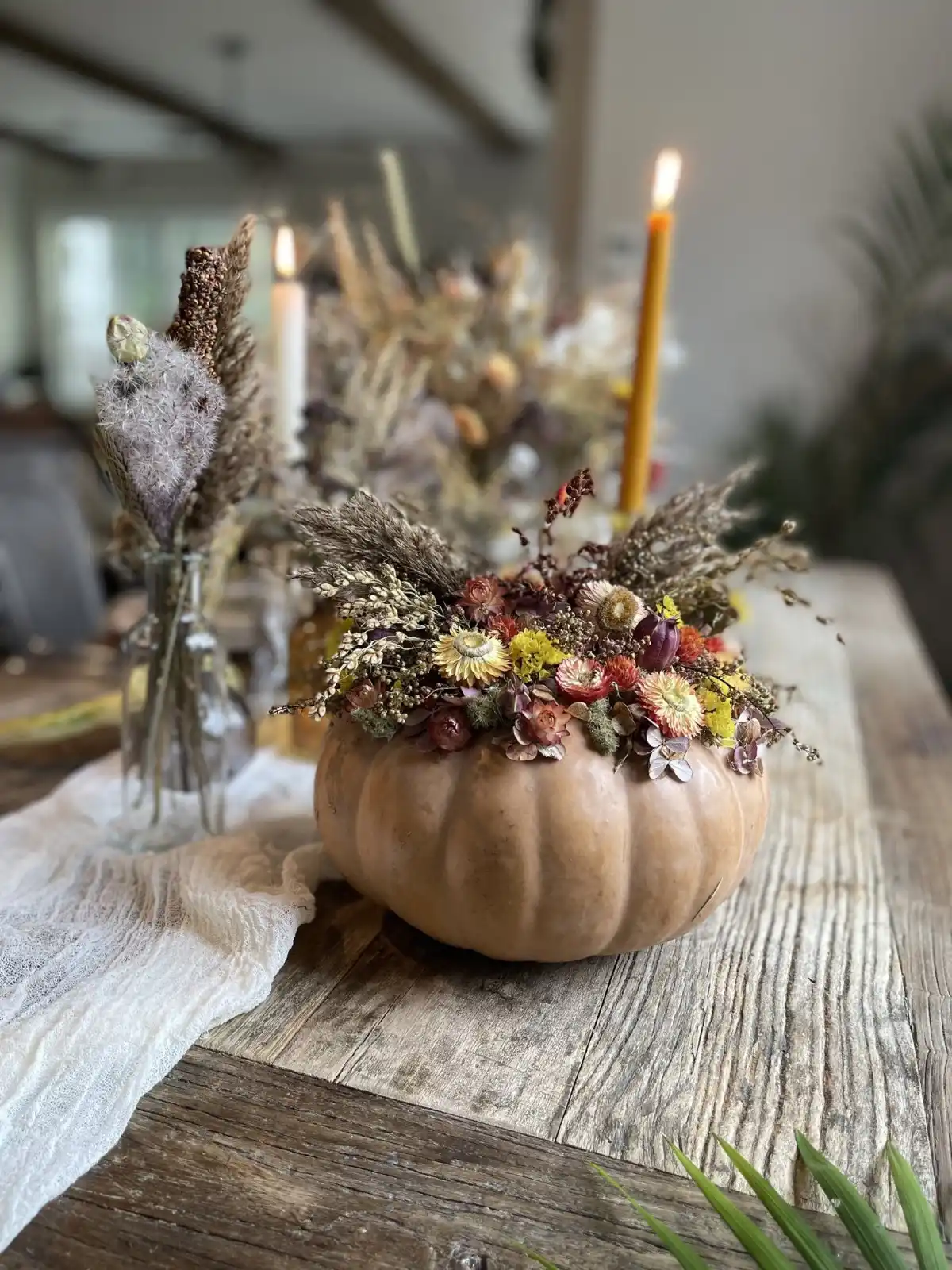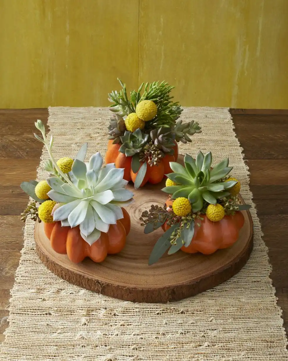 Дуже ефектно виглядають букети в гарбузах. Це надає їм особливого осіннього колориту. Букети можуть бути як із сухоцвітів, так і зі свіжих квітів. Тут центром композиції є «ваза» — вона має бути рівною і без вм'ятин.