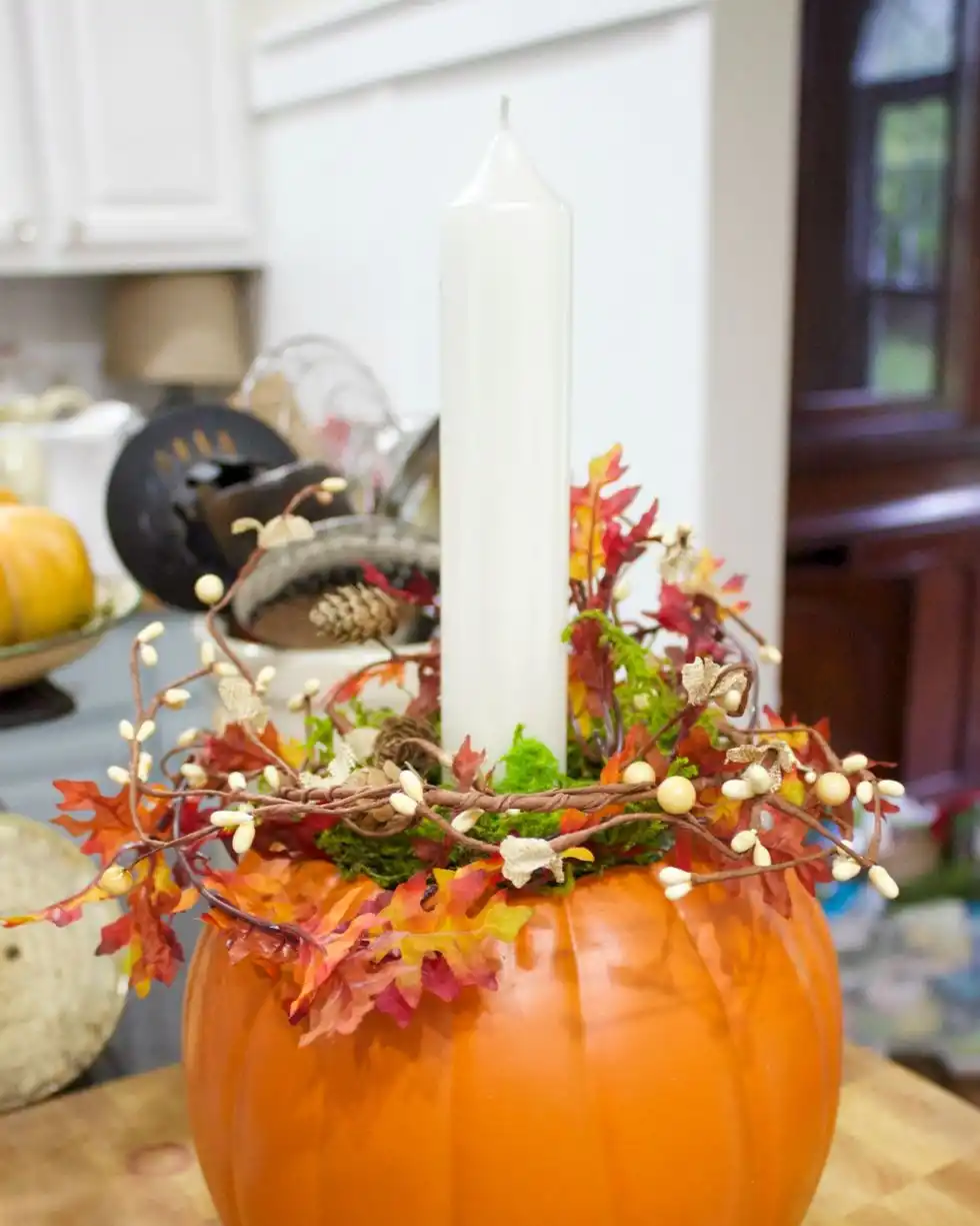 Гарбузи можна використовувати не тільки як ліхтарики Хеллоуїн, але і як красиві тематичні свічники. Тепле світло від свічок та красуня-гарбуз – осінній настрій створено! Варіацій свічників багато - можна просто проділи отвори, а можна додатково декорувати листям і гілочками. За бажання вирізати ажурні візерунки, і ваша кімната заповниться химерними тінями.