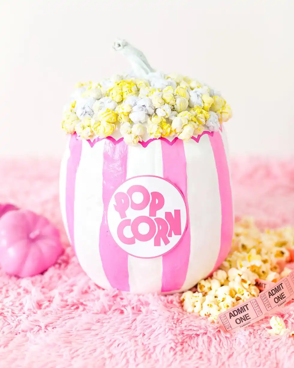 Ми вже й вирізали, і фарбували, і ставили один на одного — лишилося обклеїти! Декорувати гарбуз можна чим завгодно: квіти, фурнітура, листя, папір — все, що душа забажає. Для тих, хто ще не відійшов від Барбікора: є варіант рожевого гарбуза, декорованого під відро з попкорном! Як бачите, все просто, головне включити фантазію!