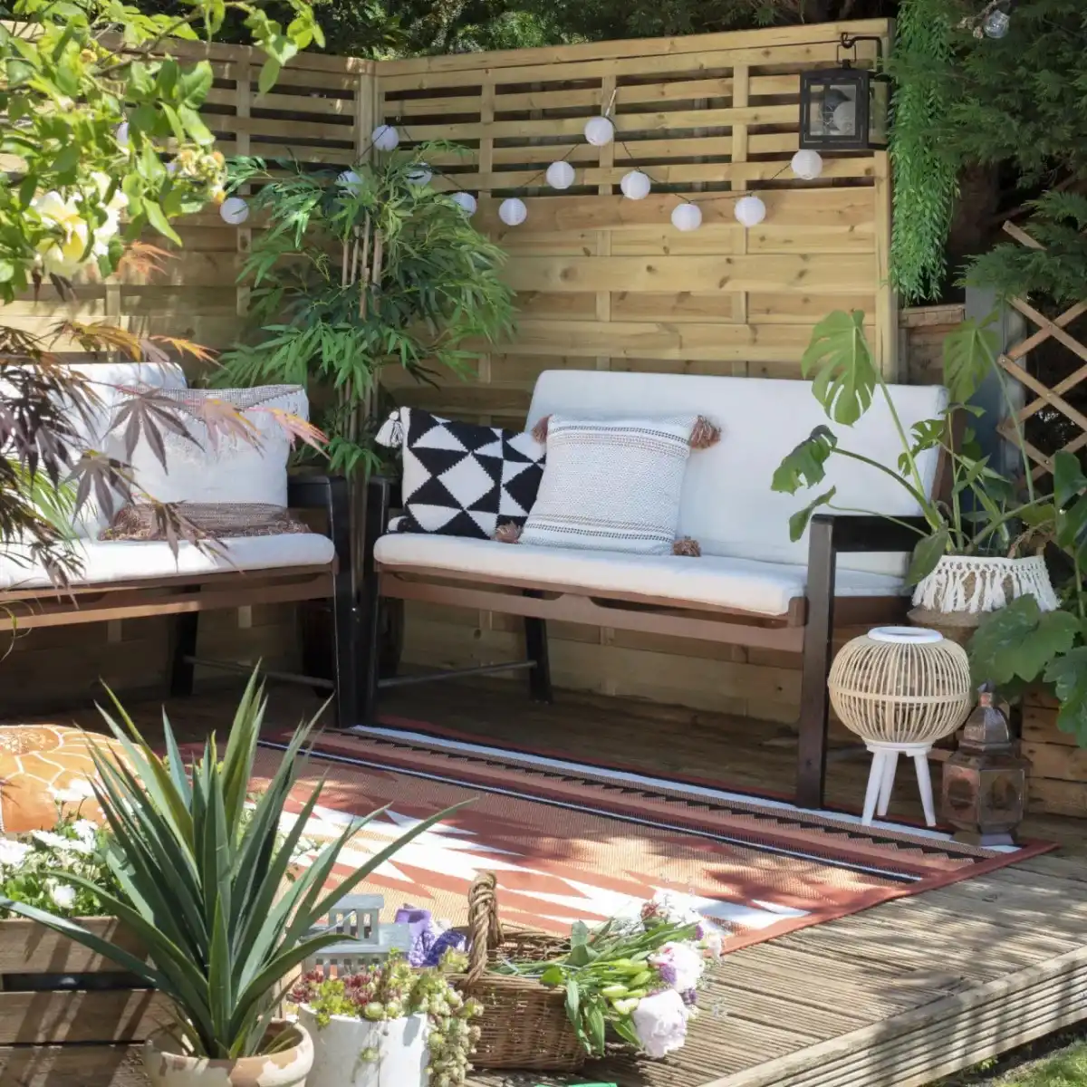 Паркан відкидає тінь, тому не всі рослини там добре ростуть. Але людям тінь у спекотний день — довгоочікуване щастя. Облаштуйте куточок біля паркану за допомогою простого настилу та садових меблів. Ви не помітите, як маленький куточок стане повноцінним місцем відпочинку.