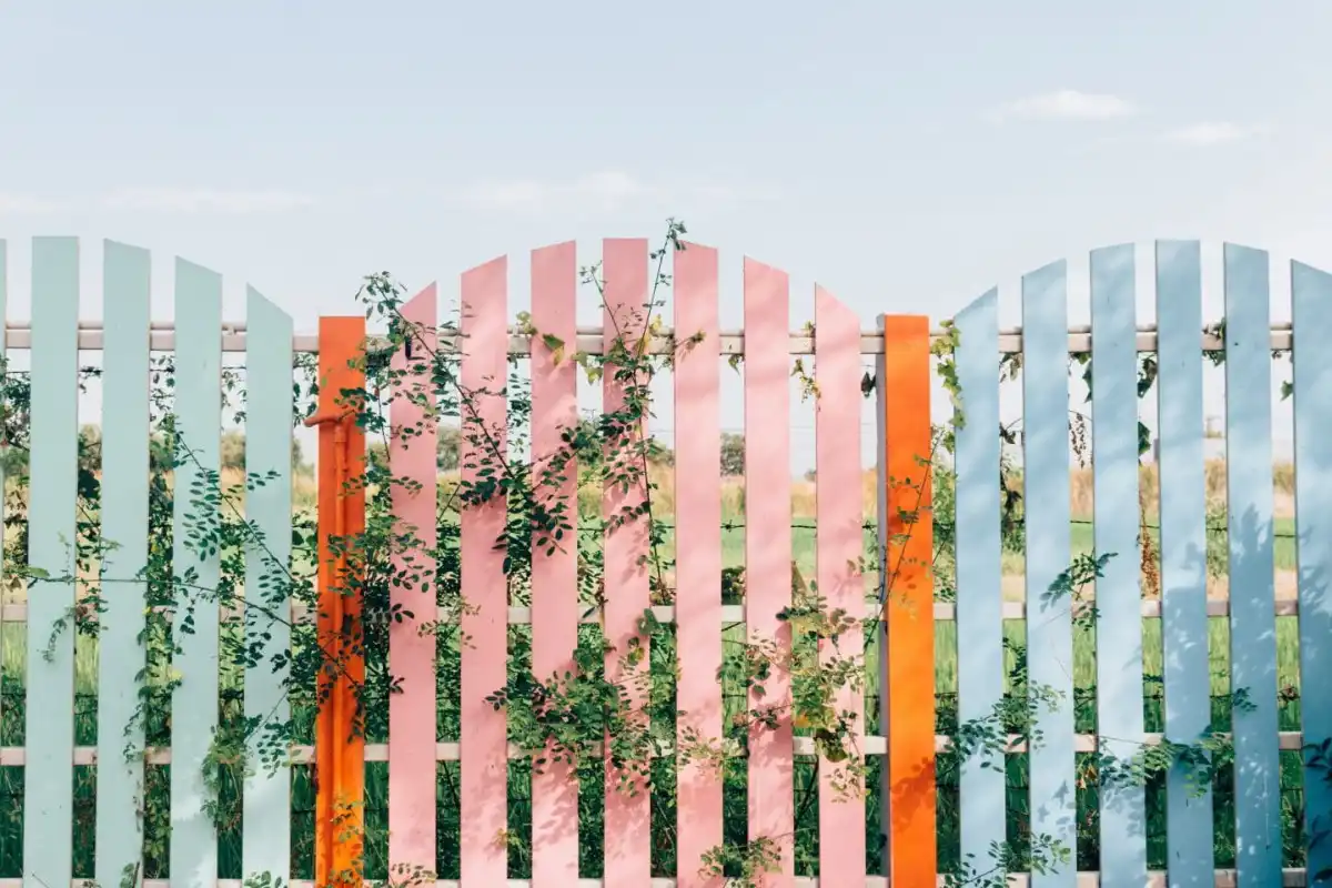 Ваша огорожа легко з монотонної клітини стане радістю для очей за допомогою яскравої фарби. Ми рекомендуємо зупинитися на пастельних тонах для самих секцій та яскравих акцентів на стовпчиках. Таким чином збережеться баланс і паркан не рябитиме в очах.