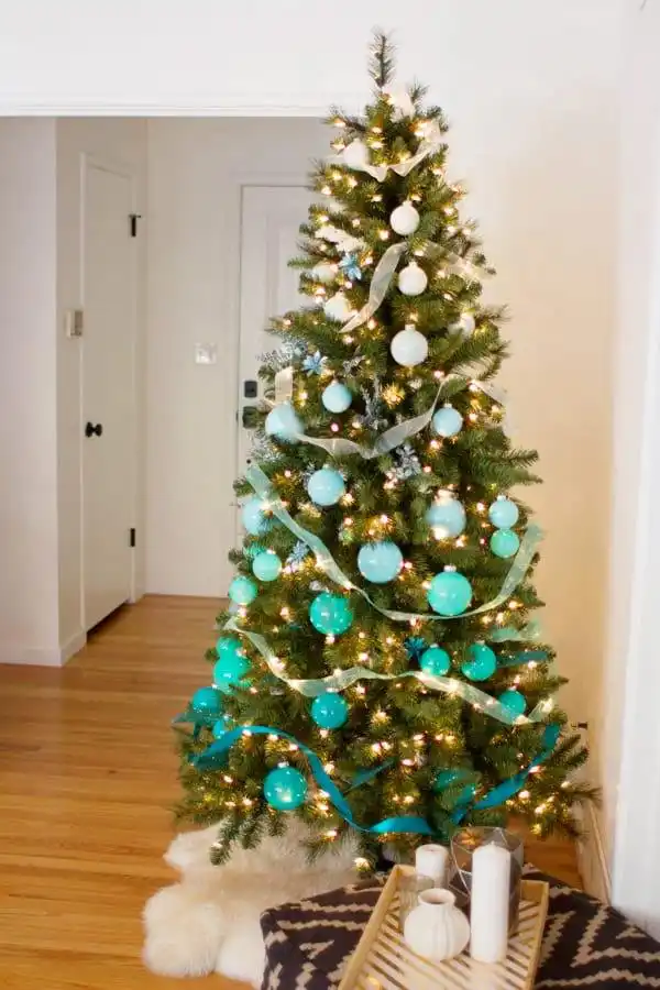 Оригінальна ідея – оформлення ялинки з ефектом градієнта. Вибирайте однакові кулі близьких відтінків, щоб перехід був плавним.