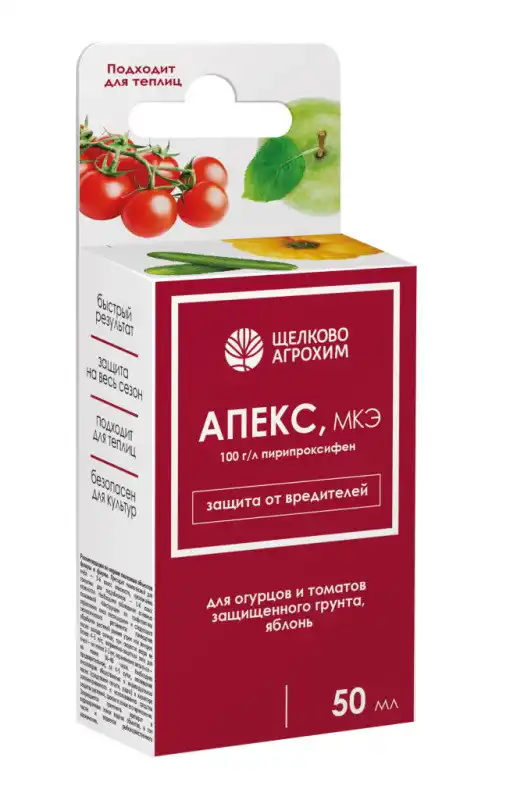 «Апекс, МКЕ» являє собою масляний концентрат емульсії пірипроксифену, що відноситься до класу ювеноїдів. Контактно-кишковий інсектицид має унікальний гормоно-фізіологічний вплив на шкідника. Він призводить до порушення нормальної течії метаморфоз-переходів між стадіями розвитку комахи (яйце-личинка-імаго).