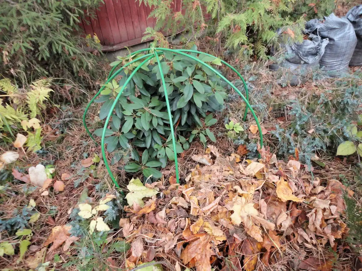 Для рослин із зимуючим листям (магонія, наприклад) вдалим варіантом у нас вийшло обкладання кущиків стеблами цикорію і¦укриття зверху товстим лутрасилом і плівкою по каркасу. Не до землі, а до половини висоти. У цьому випадку лутрасил укладається під плівку — крижаний будиночок все одно не вийде, а плівку при настанні стабільних морозів можна буде прибрати.