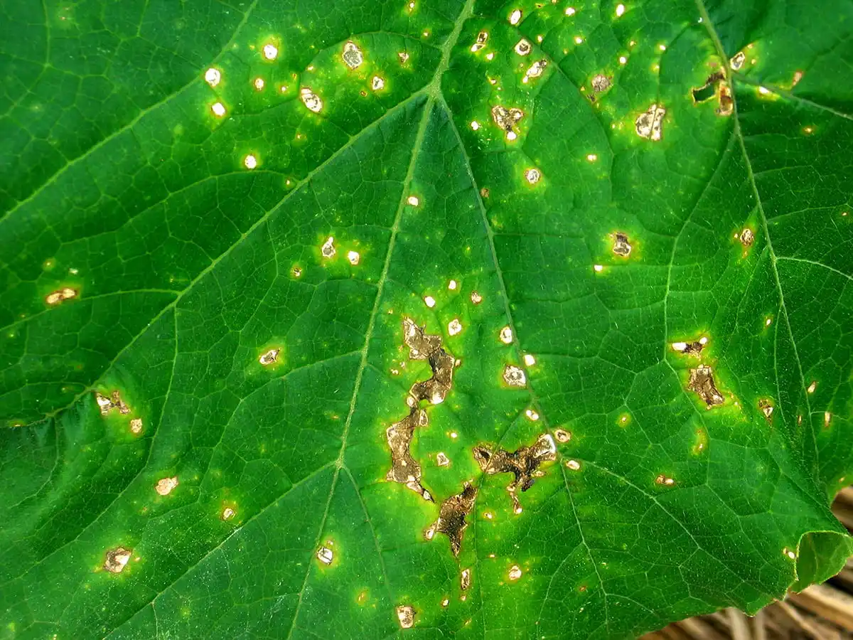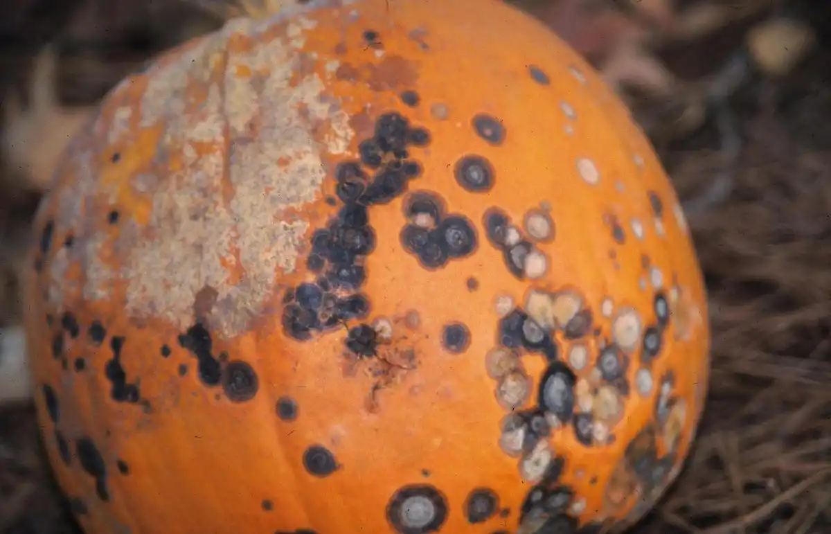 Це захворювання гарбуза вражає як плоди, і листя. Спочатку воно проявляється у вигляді жовто-білих цяток з обідком на листі, а потім поширюється на плоди.