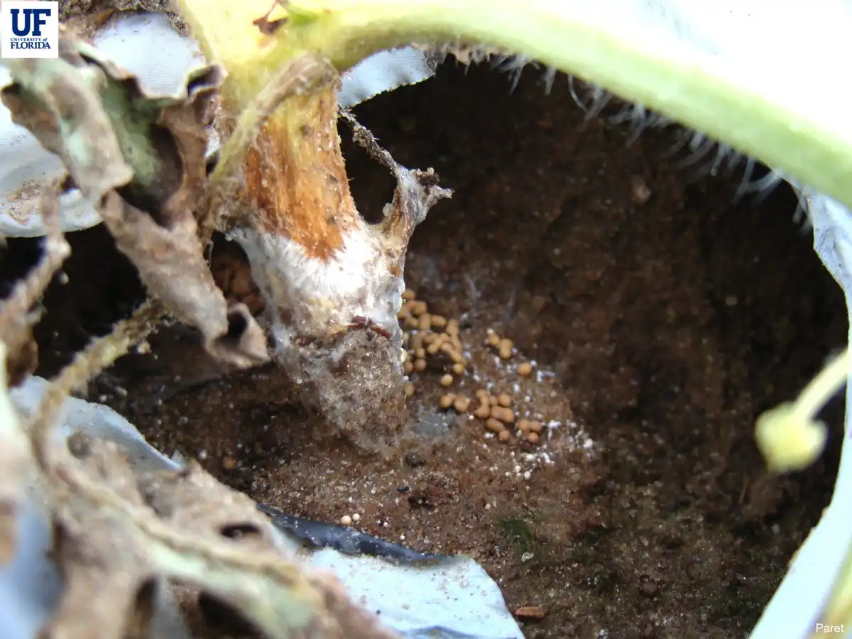 Хвороба викликається збудником Athelia rolfsii. Зараження проявляється у вигляді округлих наростів на нижніх стеблах, які лопаються і викликають ураження тканин. Зрештою це призводить до загибелі рослини. Athelia rolfsii любить жарку і вологу погоду і легко переміщається в різні частини саду на взутті, одязі або через садовий інвентар. Жодного ефективного лікування, крім знищення заражених рослин, не існує. Однак ви можете вжити профілактичних заходів.