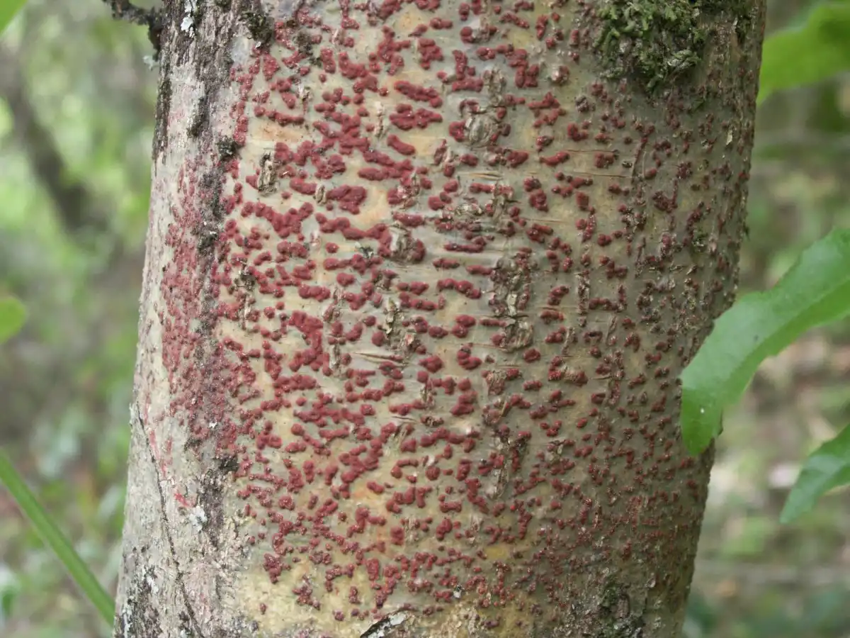 В області ураження утворюються маленькі чорні горбики, спороутворюючі структури, які з часом стають білими. Дощ і вітер розносять суперечки гриба, здатні заразити будь-яку рану дерев. Проте вразити неушкоджену кору захворювання не здатне.