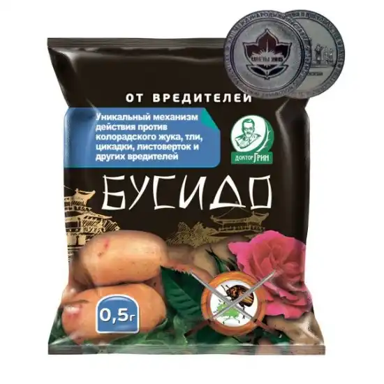 Інсектицидна сполука препарату має кишкову, контактну та системну дію, причому починає працювати дуже швидко. У стадії «зелений конус» можна провести повторну обробку дерев та чагарників фунгіцидними засобами або першу, якщо ви прогаяли відповідні терміни. Щоб полегшити роботу, змішайте робочий розчин препарату «Бусидо» з фунгіцидом «Зберігач».