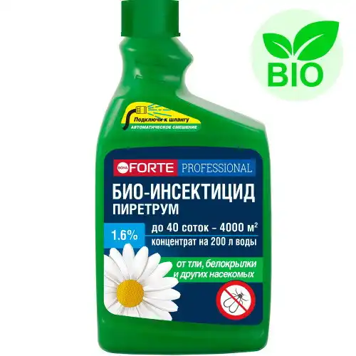 Ідеальний варіант — біоінсектоакарицид Bona Forte на основі піретруму (Далматської ромашки). Контактний інсектоакарицид швидко знищує широкий спектр шкідників від попелиці до гусениць та жуків, але на світлі розкладається за 2-3 години. Однієї каністри вистачає для приготування 200 л робочого розчину, але в одне дерево чи кущ йде 2-5 л, залежно від розміру рослини.