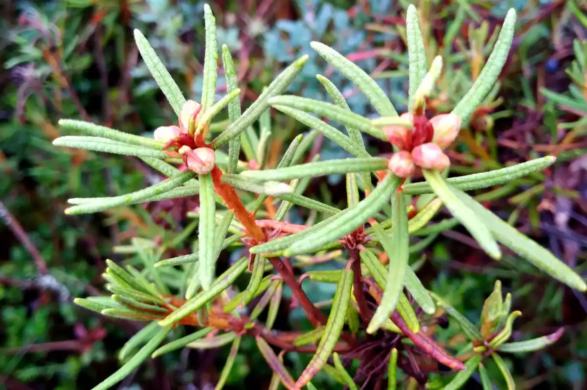 Чагарник зазвичай досягає висоти від 30 до 130 см і має вузькі, схожі на хвоїнки, темно-зелене листя з хвойно-смолистим ароматом при їх розтиранні. Краї листової пластини закручені вниз, що притаманно сімейства вересових. Нижня сторона листа вкрита буро-іржавою повстю, як і молоді стебла рослини. Восени рідкісний пушок добре помітний і по всій поверхні листа.