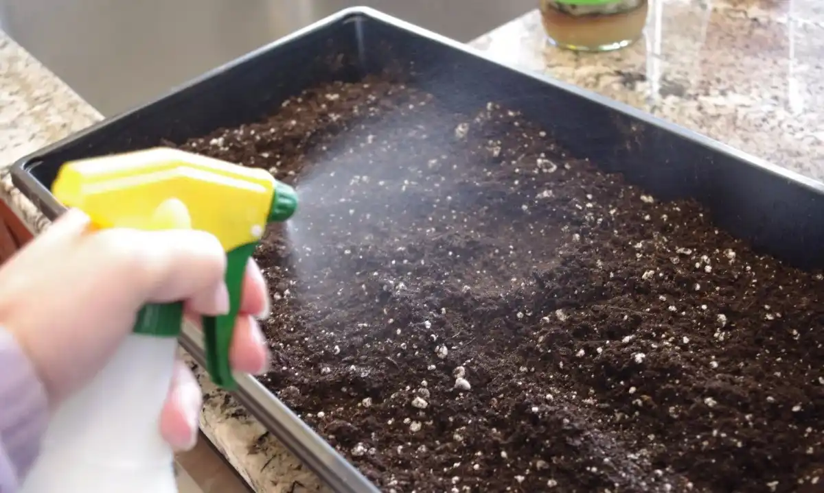 Змочіть стартову суміш для насіння теплою мильною водою (використовуйте біорозкладний засіб для миття посуду!) перед посадкою насіння. Після того, як посадите насіння, знову збризкайте все мильним розчином з пульверизатора. Миючий засіб у милі служить двом цілям: він почне руйнувати воскову оболонку насіння (хімічна скарифікація) та допомагати ефективніше наситити субстрат вологою.
