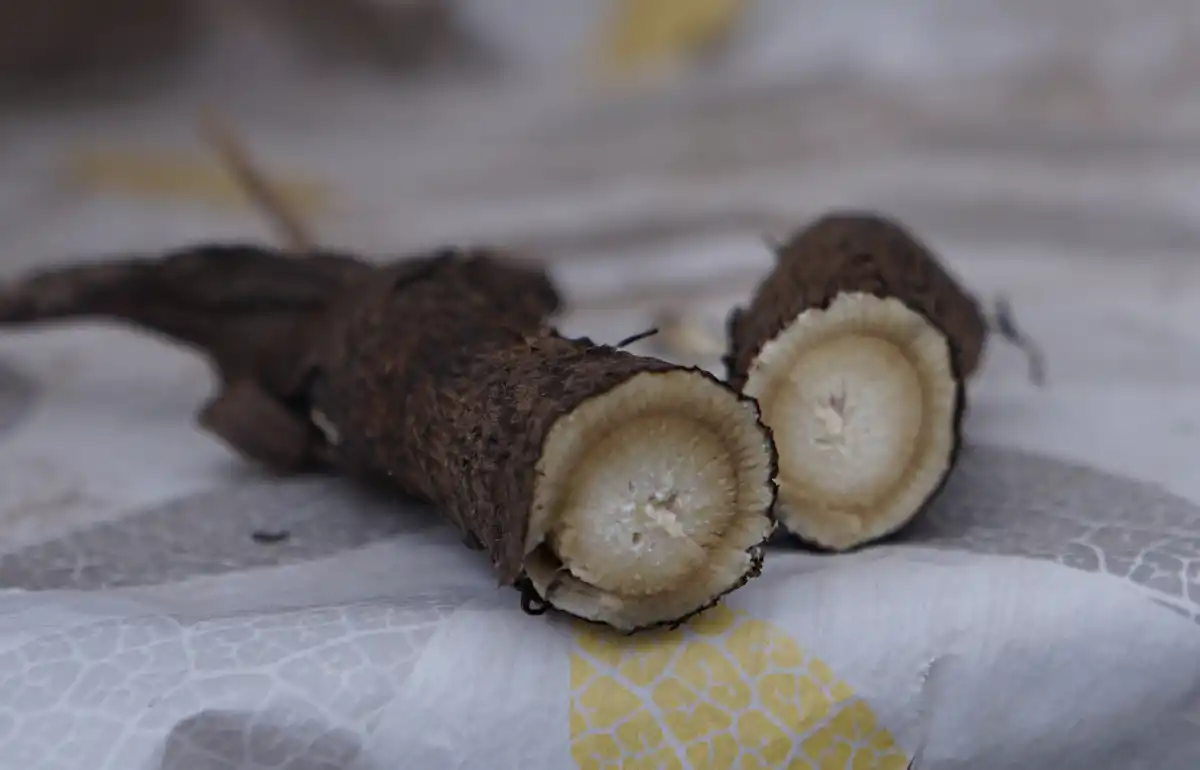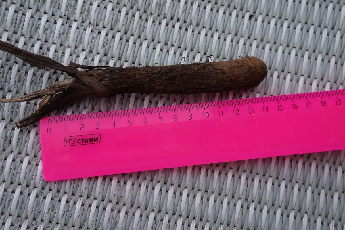 Щодо довжини коренів я не можу нічого сказати, оскільки, на жаль, мені не вдалося викопати жодного цілого коріння. Деякі зі зібраного мною коріння виглядали як морква блідого кольору без загостреного кінця. У той час як інші були розгалуженими незвичайною формою, більше схожі на коріння женьшеню.