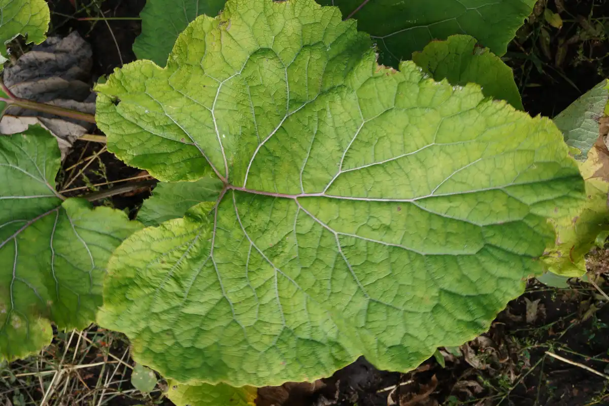 Листя дуже велике, серцеподібне, опушене волосками на нижній стороні. Найбільше листя знаходиться біля основи рослини, а просуваючись вгору по стеблі, воно зменшується. Нижнє листя має цілісні черешки з жолобком на верхній поверхні.