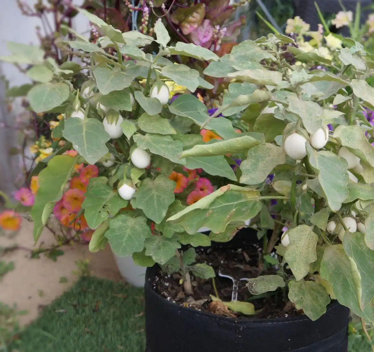 Вирощування баклажанів "Золоте яйце" справило на мене сприятливе враження. Кущики в контейнері вийшли невисокими, близько 40 сантиметрів, при цьому вони були дуже компактними, прямостоячими та займали мінімум місця. На відміну від стандартних баклажанів з великими плодами, цей сорт має маленьке листя, тому кущ не затуляє інші рослини, і в одну ємність можна садити відразу кілька екземплярів.
