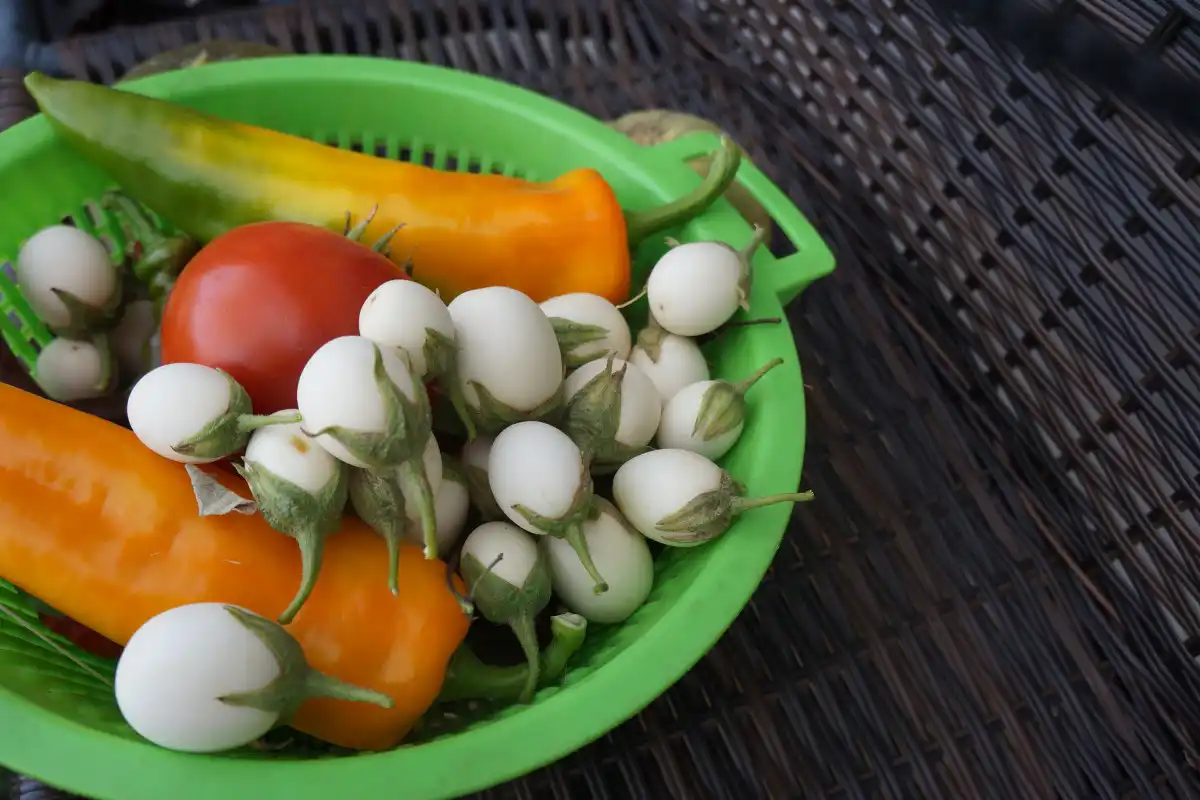 Другу партію врожаю я зняла наприкінці вересня. Частина плодиків уже почали жовтіти, і я залишила їх для повного дозрівання, щоб подивитися на незвичайні «яєчка» золотого кольору, а ті, що ще залишалися білими, знову приготувала. Але виявилося, що цього разу я все ж таки перетримала плоди на кущі, тому вони стали трохи гірчити, шкірку з готових баклажанів довелося видалити, оскільки вона стала грубувата.