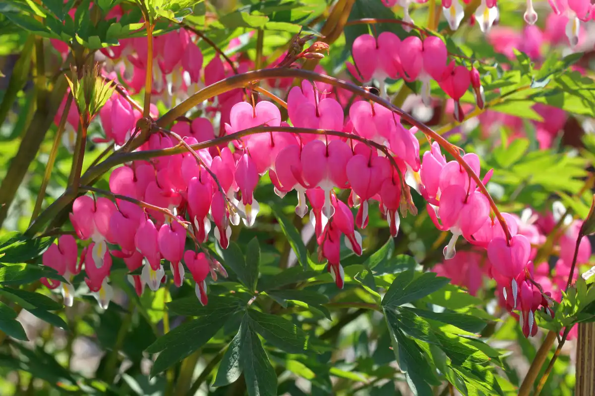 Дицентра, або «розбите серце». Її варто було б вирощувати і тільки через її мереживне, дрібно порізане синьо-зелене листя. Тим не менш, для більшості садівників саме квітки (які нагадують химерні рожеві колби або серця) є основною цінністю цієї прекрасної рослини, що прийшла з американських лісів. Цвітіння спорадично повторюється з весни до осені, але деякі види можуть відмирати наземна частина після зав'язування насіння.