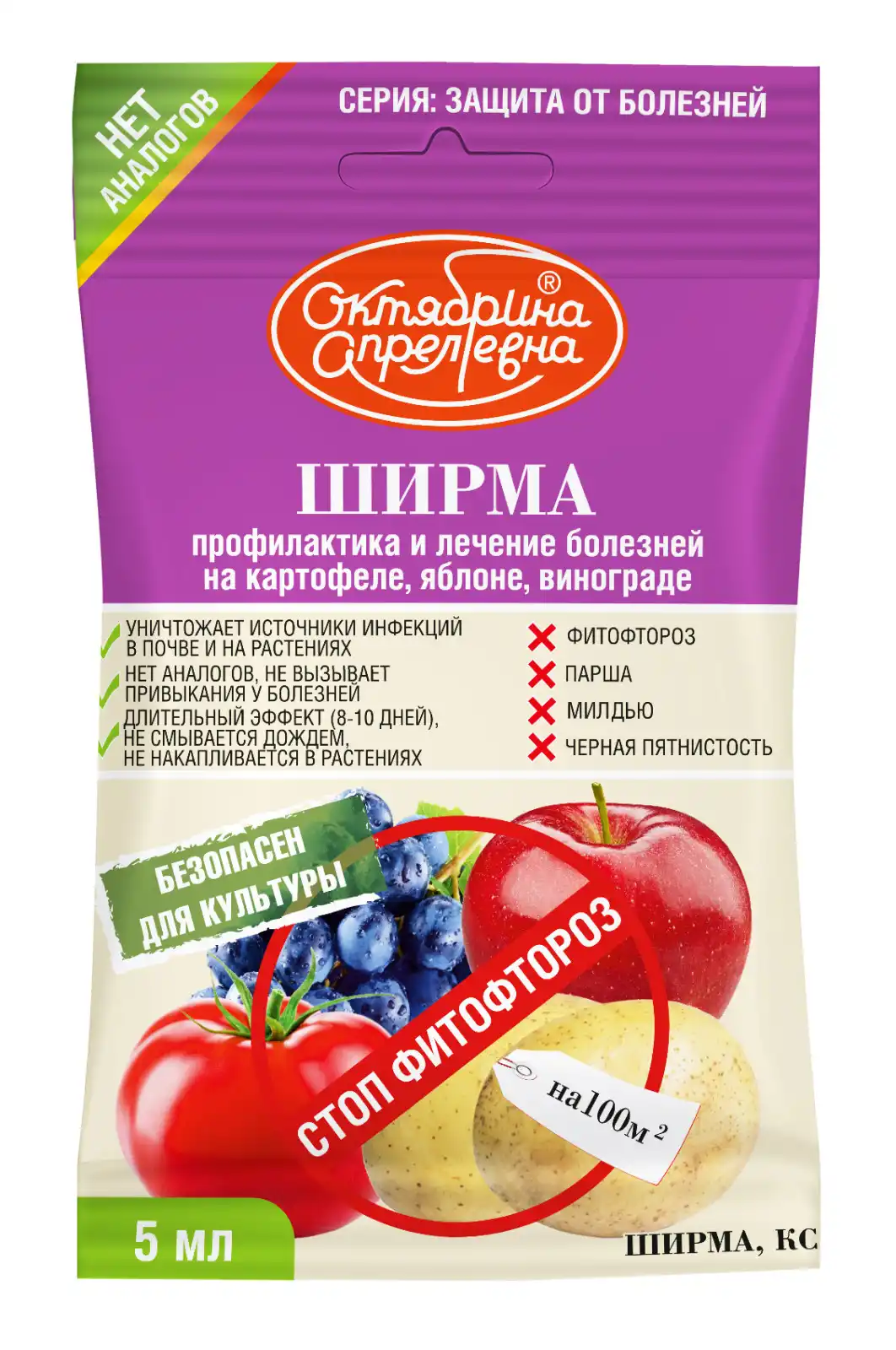 Ширма - високоефективний контактний фунгіцид, призначений для боротьби з найпоширенішими захворюваннями рослин - фітофторозом картоплі, паршою яблуні, мілдью і чорною плямистістю виноградної лози. Щоб не витрачатися на кілька препаратів проти кожної окремої хвороби, вітчизняна компанія «Щолково Агрохім» створила інноваційний препарат Ширма, який діє одразу проти перелічених проблем.