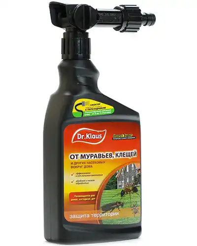 Засіб від кліщів, мурах та інших комах Dr.Klaus, що повзають, випускається в літрових каністрах у двох видах - з ежектором і без нього. Ежектор - це потужний розпилювач, який працює від централізованого водопроводу або звичайного побутового насоса. Потужний і рівний струмінь дозволяє рівномірно обробити будь-яку територію від кліщів за дуже короткий час. Для приведення пристрою до роботи потрібно лише підключити шланг та відкрити кран. Змішування засобу з водою відбувається автоматично, при цьому витрата розчину настільки економічна, що однієї каністри вистачає для обробки до 20 соток. А тривалість ефекту становить 1,5 місяців.