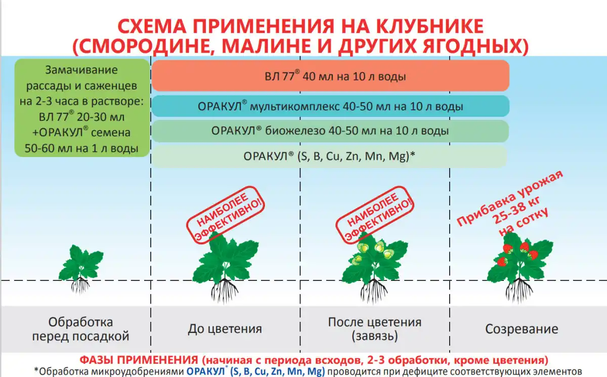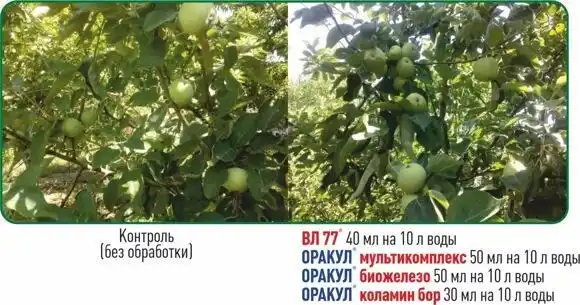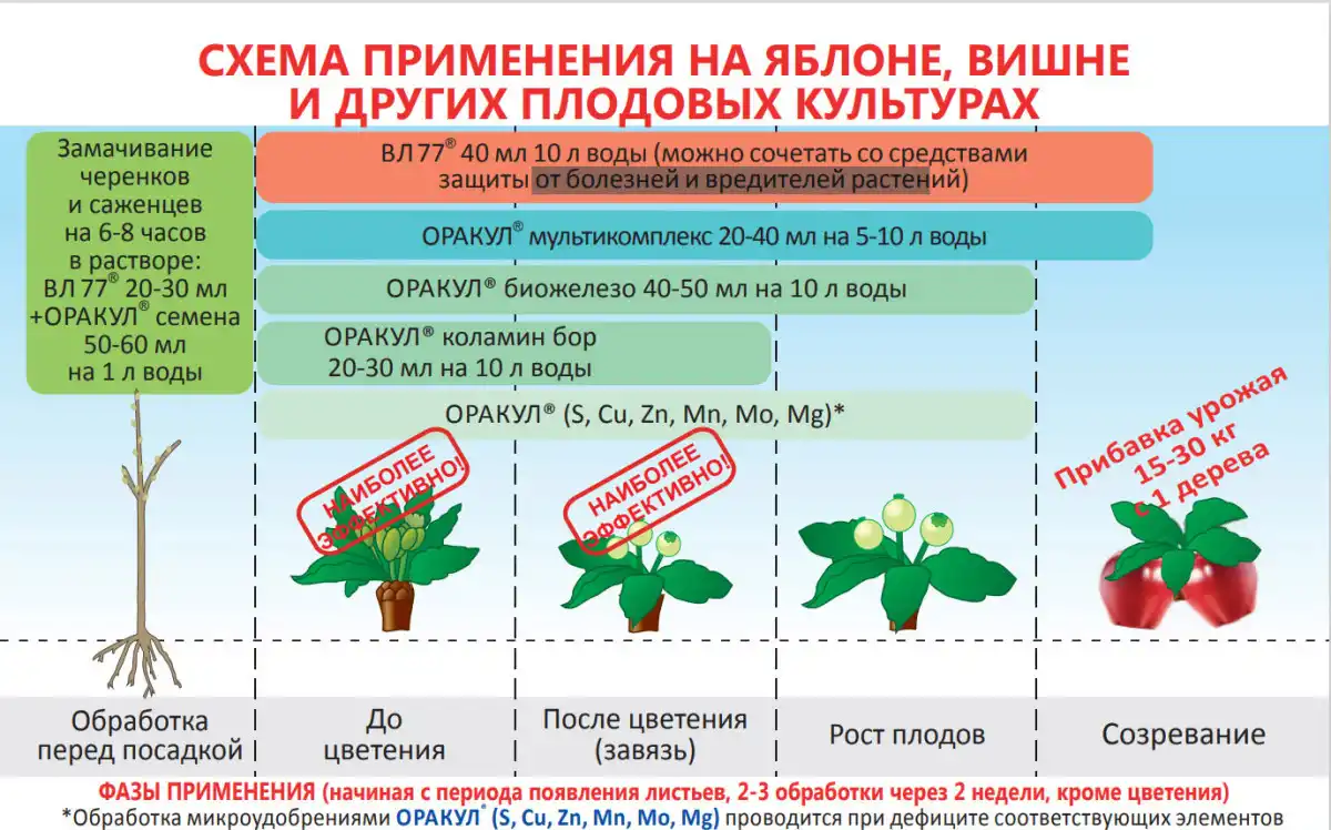 Це вичерпний перелік елементів, необхідних плодовим деревам та ягідним культурам у середині вегетації. Витрата добрив низька - для підживлення потрібно розвести у відрі води всього 40-50 мл препарату на 10 л води. Потім рослини обприскують робочим розчином до змочування листових пластин. ОРАКУЛ мультикомплекс безпечний і може застосовуватися разом із засобами захисту та догляду.